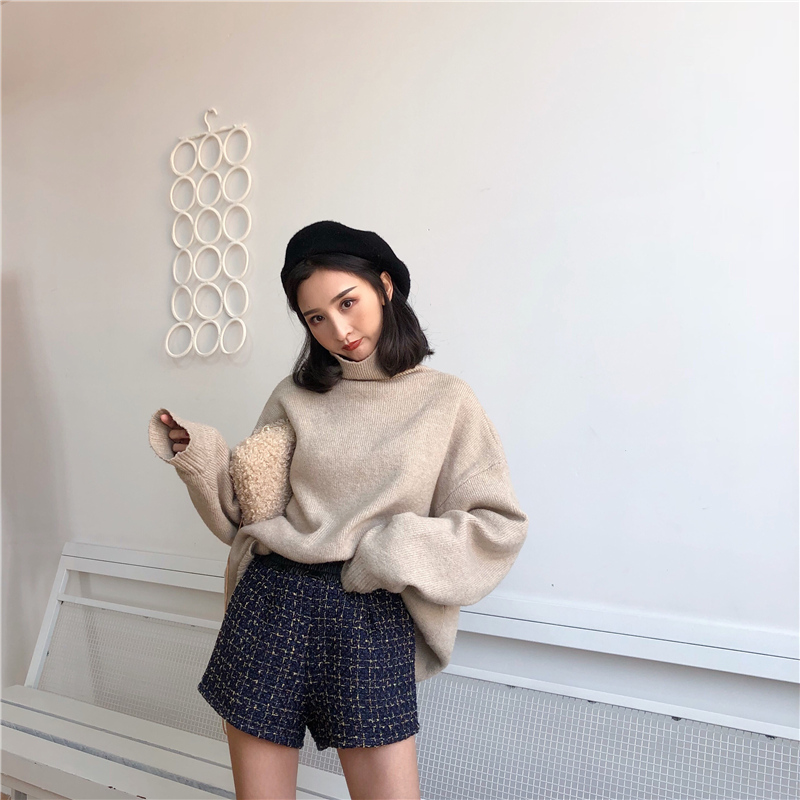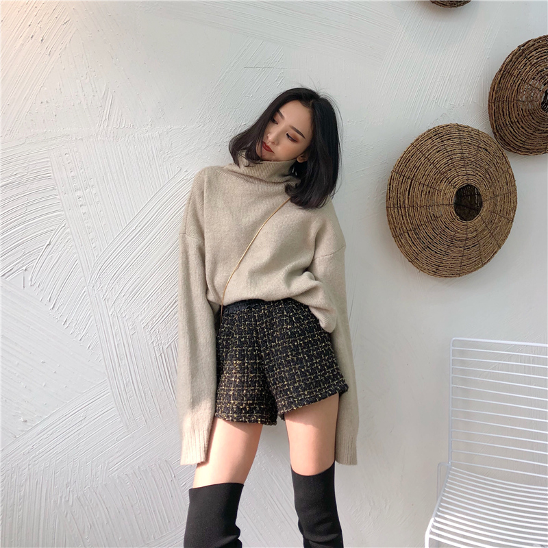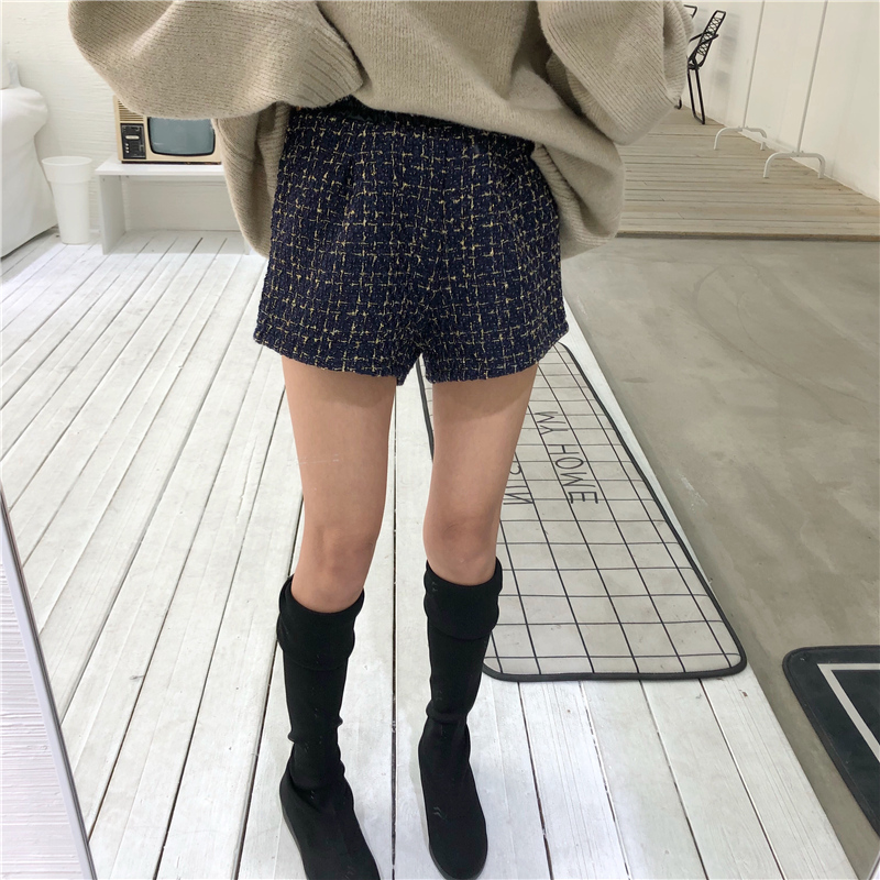 / 褲子新款韓版百搭pu皮拼接格子粗花呢短褲女時尚加絨寬松闊腿褲潮