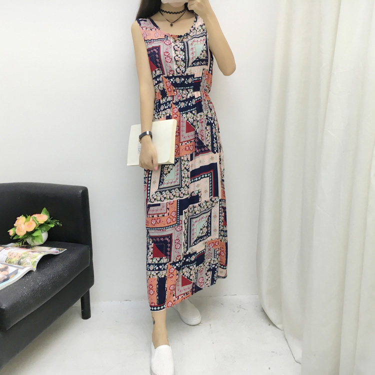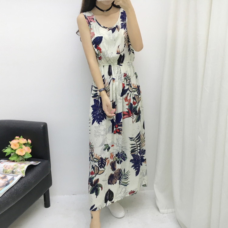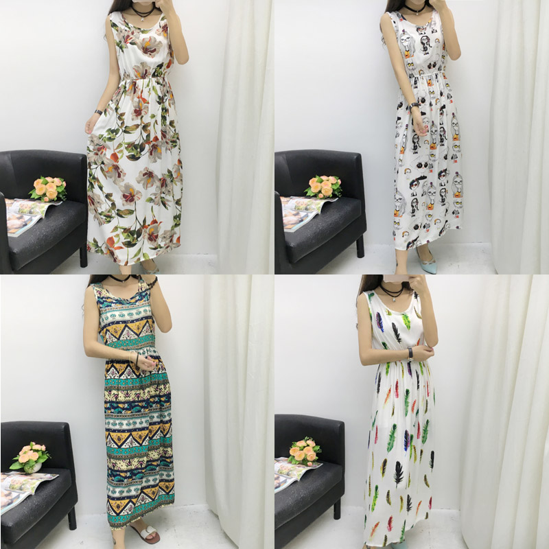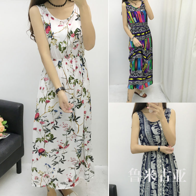 / 印花渡假長裙綿綢波西米亞中長款人造棉碎花沙灘背心棉綢連衣裙夏