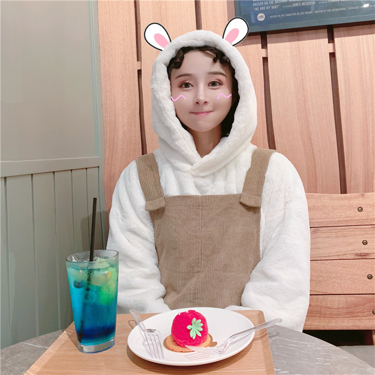 / 韓版時尚休閑套裝秋冬女裝毛茸連帽衛衣+燈芯絨背帶連體褲兩件套