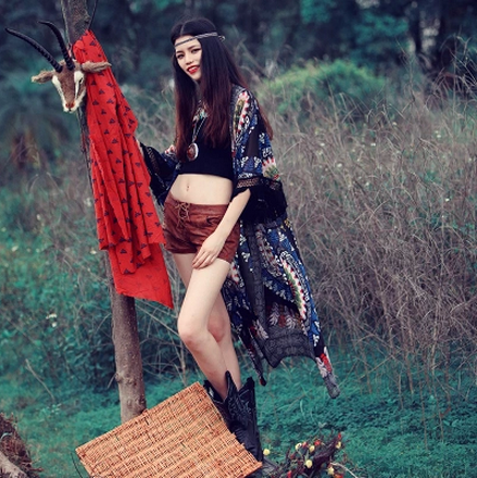 / 泰國2017春夏民族風海邊沙灘度假流蘇雪紡印花開衫防曬衣超長款女
