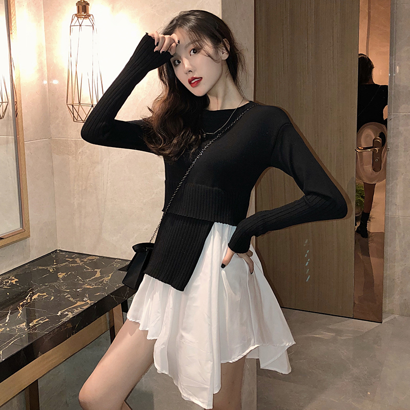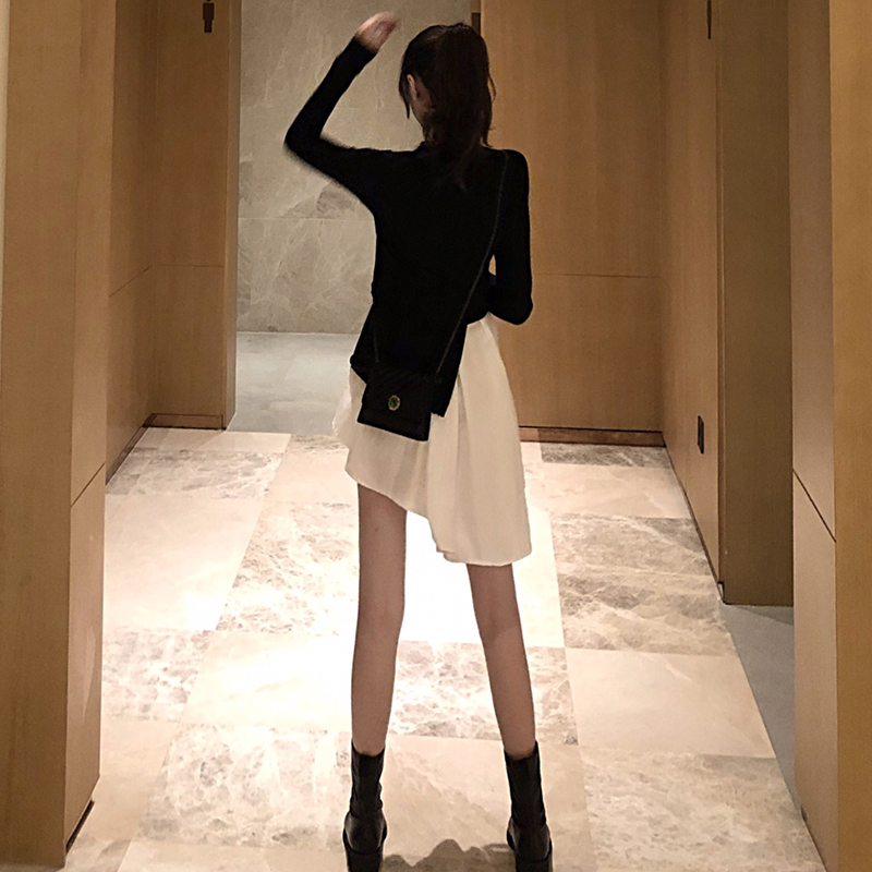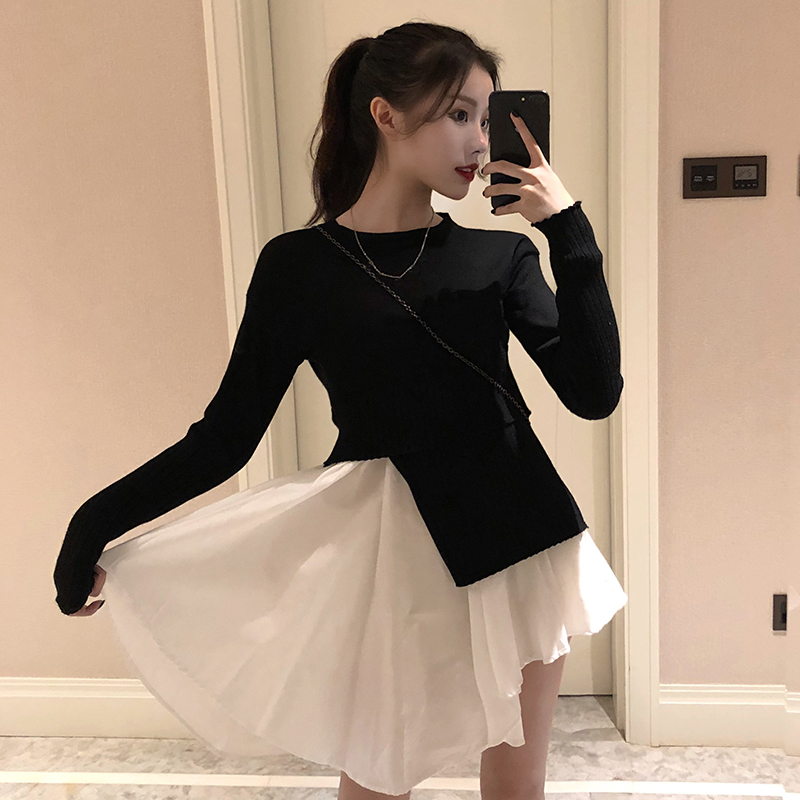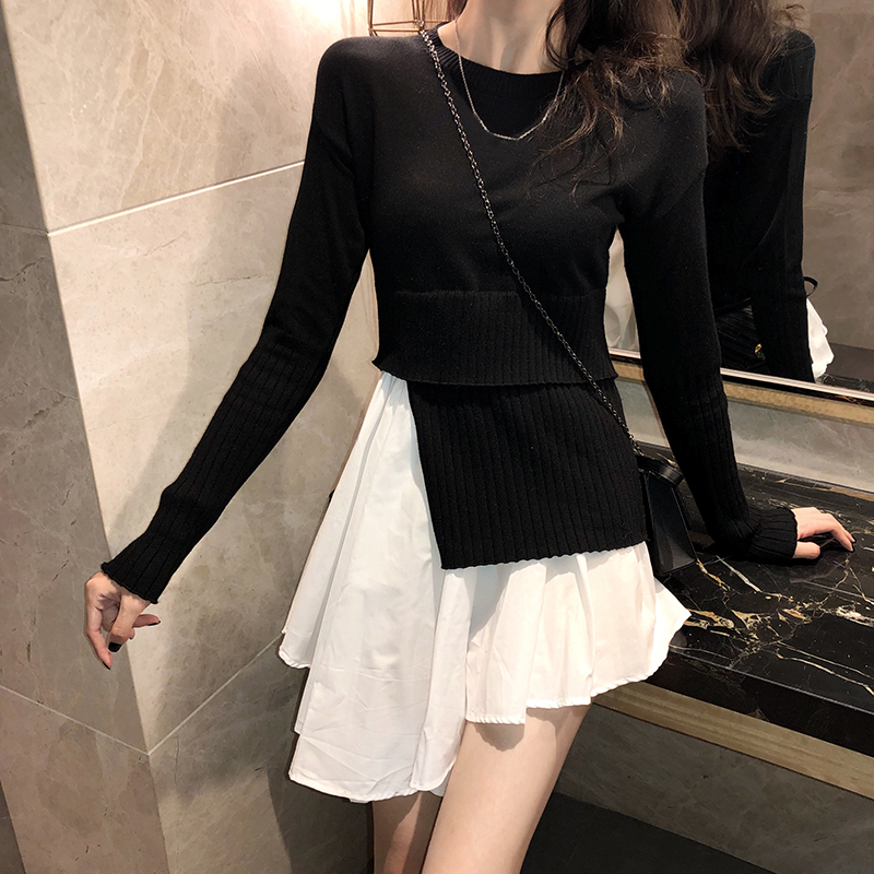 / 時尚撞色拼接收腰顯瘦egg連衣裙子女秋冬裝新款復古法式A字桔梗裙