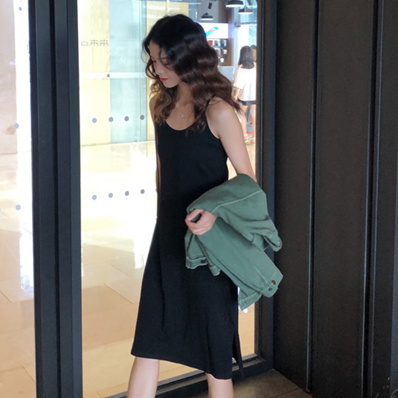早秋兩件套女裝新款時尚明線長袖牛仔短外套開叉黑色吊帶連衣裙子