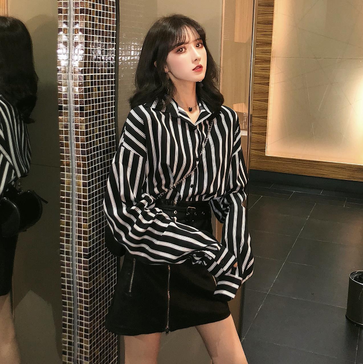 / 2018秋裝新款韓版百搭打底條紋長袖襯衫PU皮高腰半身裙時尚套裝女