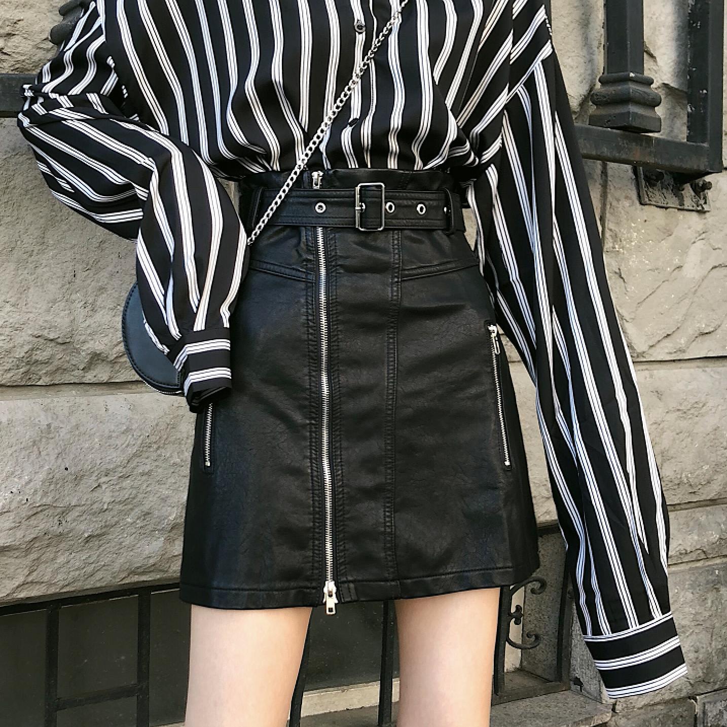 2018秋裝新款韓版百搭打底條紋長袖襯衫PU皮高腰半身裙時尚套裝女