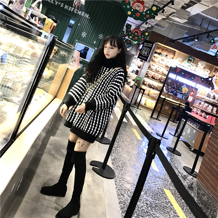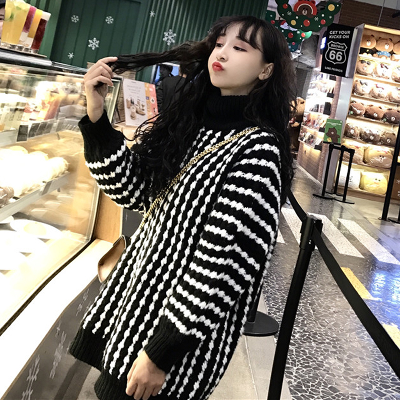 秋冬韓版中長款慵懶風寬松條紋加厚加粗套頭高領毛衣針織衫外套女