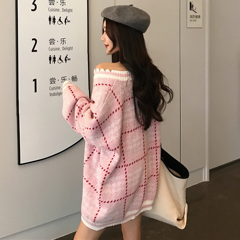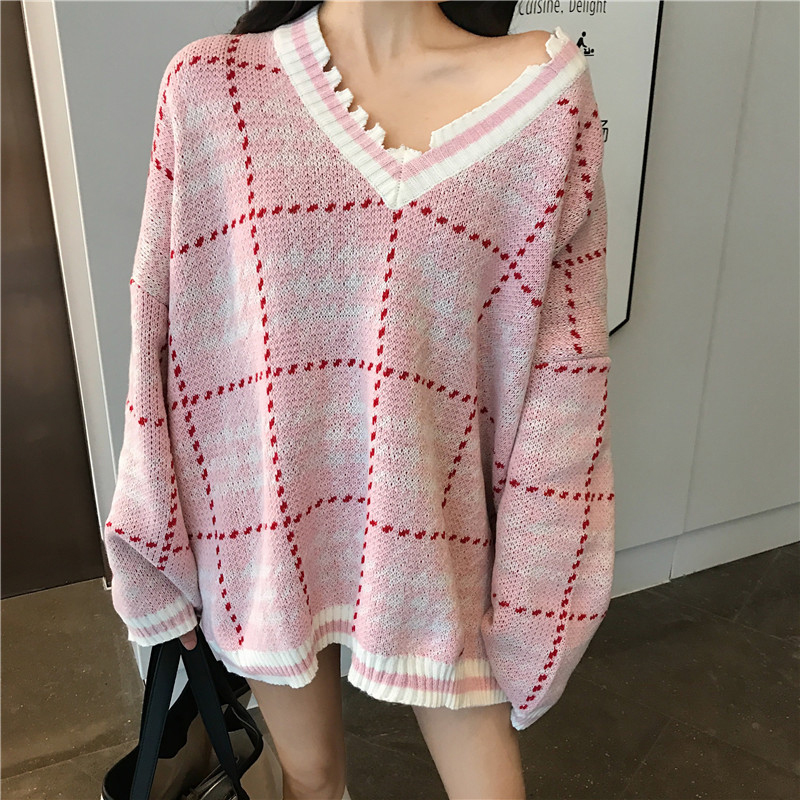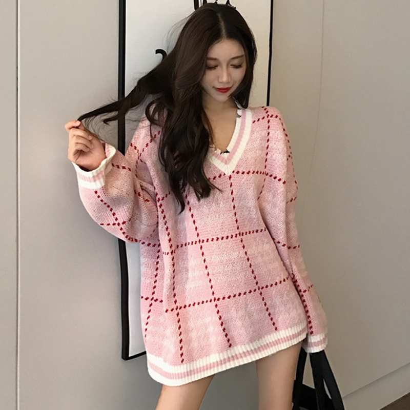 V領格子毛衣女秋冬裝2018新款寬松慵懶針織外套學生長袖休閑上衣