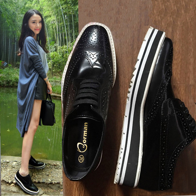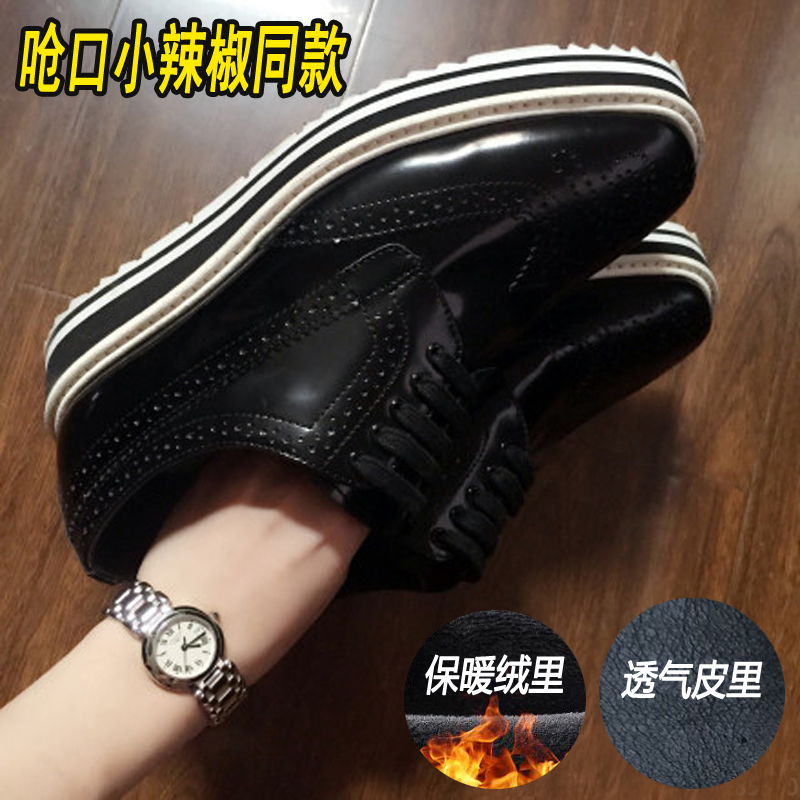 / 秋冬加絨新款厚底松糕鞋單鞋休閑系帶英倫風布洛克雕花女鞋
