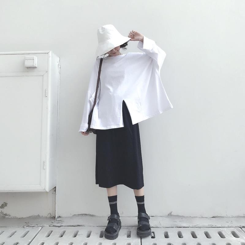 / 秋裝女裝韓版簡約純色寬松開叉基礎款白色長袖套頭T恤上衣打底衫