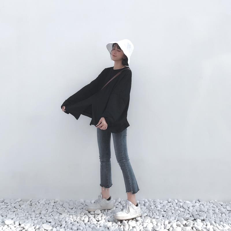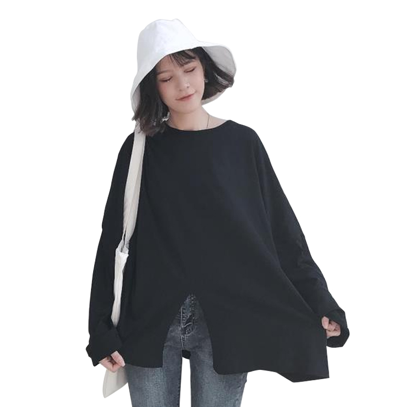 秋裝女裝韓版簡約純色寬松開叉基礎款白色長袖套頭T恤上衣打底衫