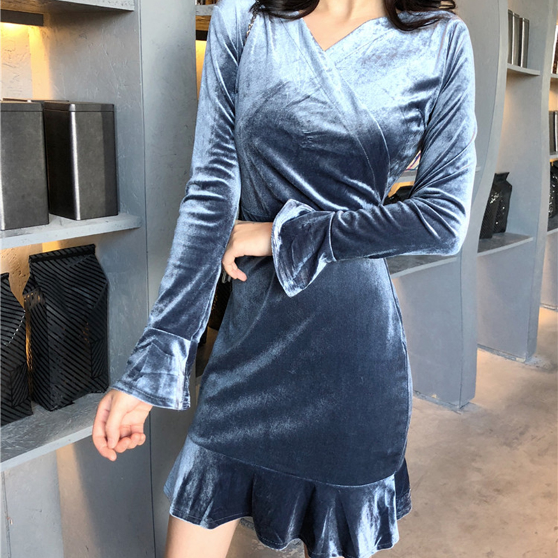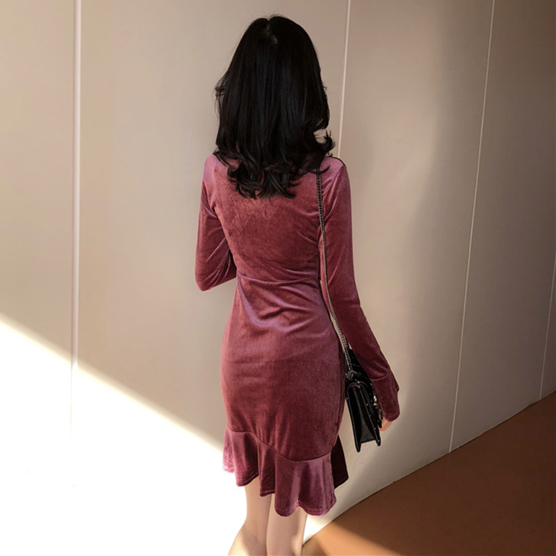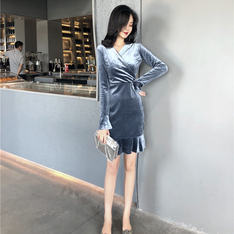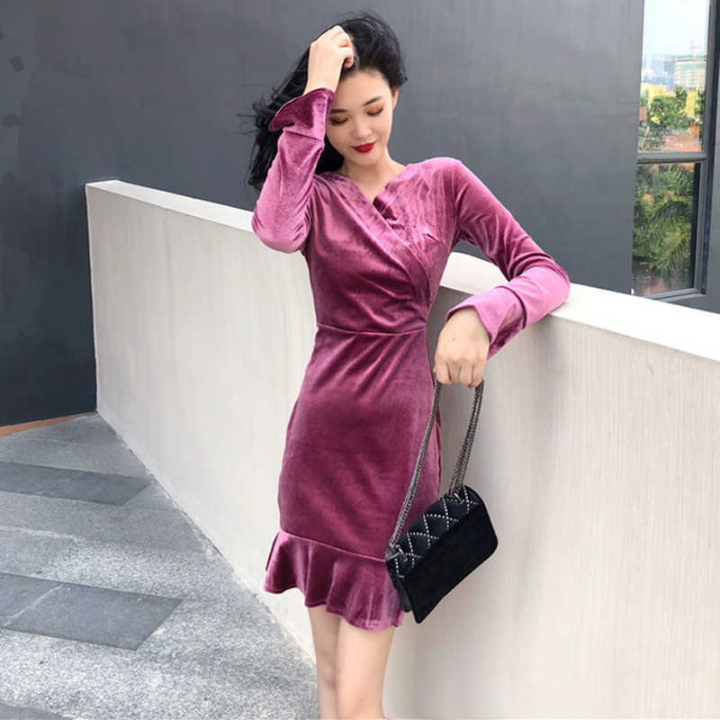 / 港味加叉V領絲絨包臀長袖連衣裙女冬裝2018新款復古法系桔梗裙子