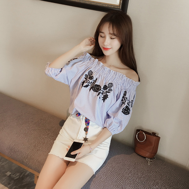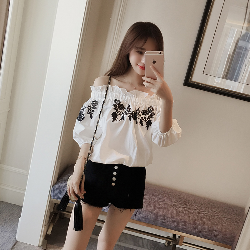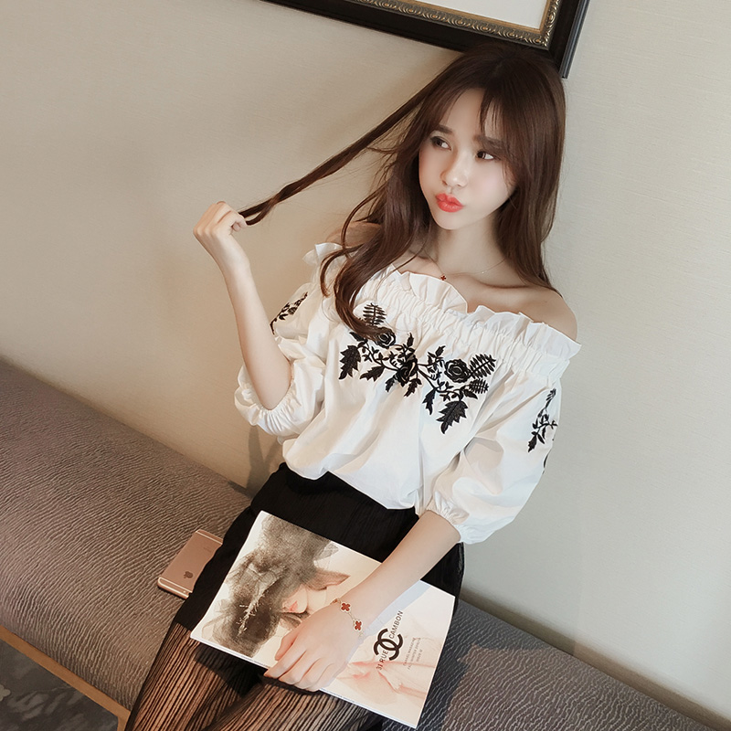 2017夏季新款甜美泡泡袖花朵刺繡娃娃衫一字領寬松短袖套頭上衣女