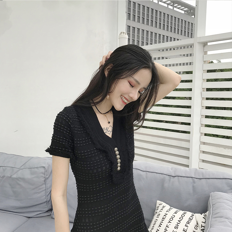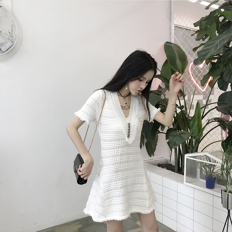 / 港味復古chic新款韓版百搭純色V領設計感寬松顯瘦中裙時尚連衣裙