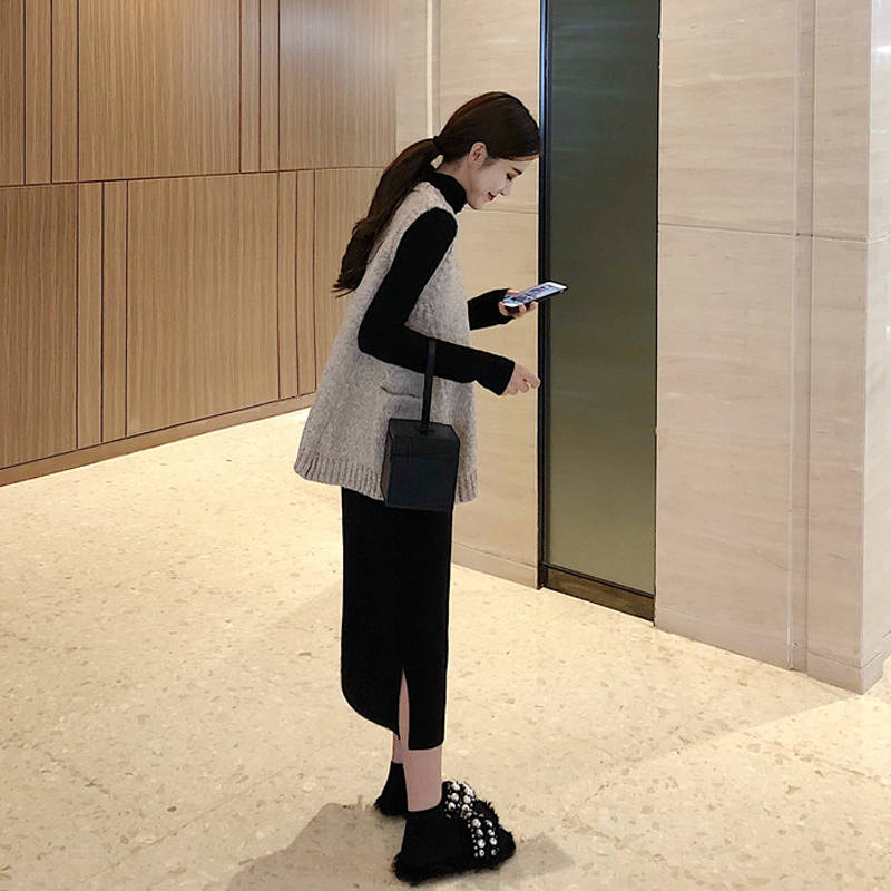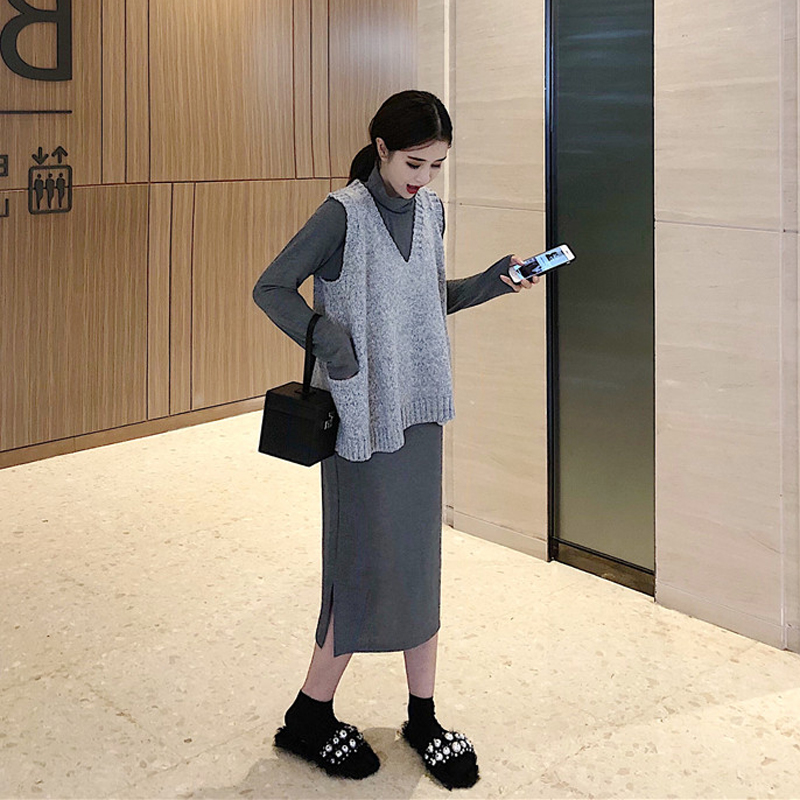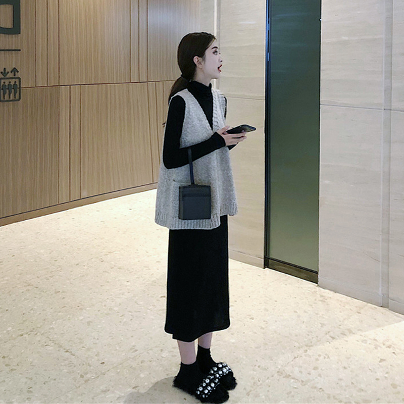 / 早秋毛衣配裙子法式初戀氣質長裙復古馬甲過膝針織兩件套裝秋冬