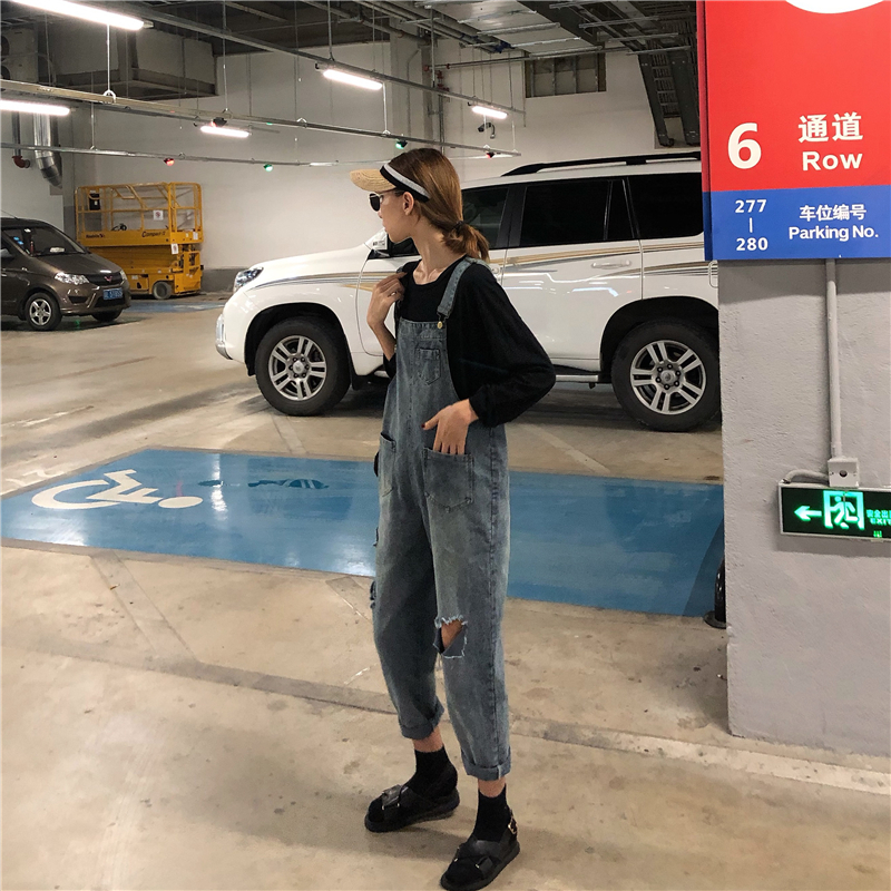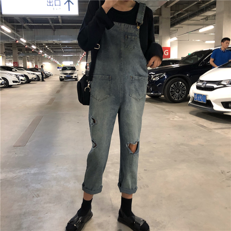 2018新款女夏學院風百搭復古chic風口袋破洞小清新學生牛仔背帶褲