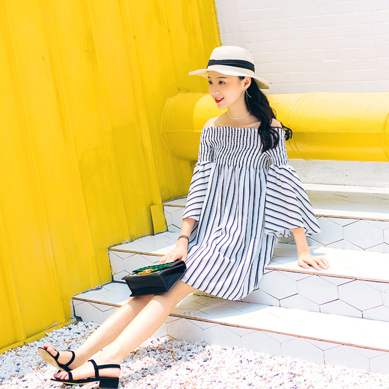 / 一字領露肩條紋連衣裙夏裝新款女裝韓版學生小清新喇叭袖裙子