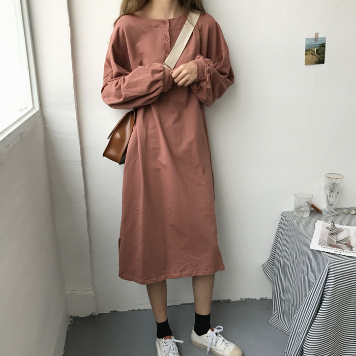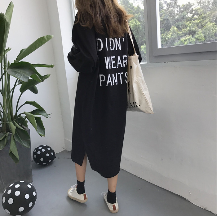 秋季女裝韓版后背字母長袖T恤寬松中長款套頭衛衣顯瘦連衣裙長裙