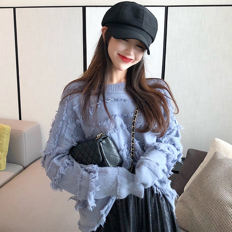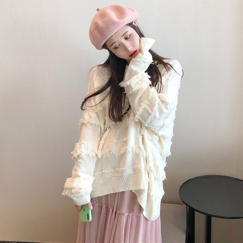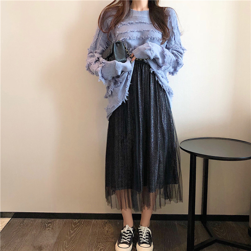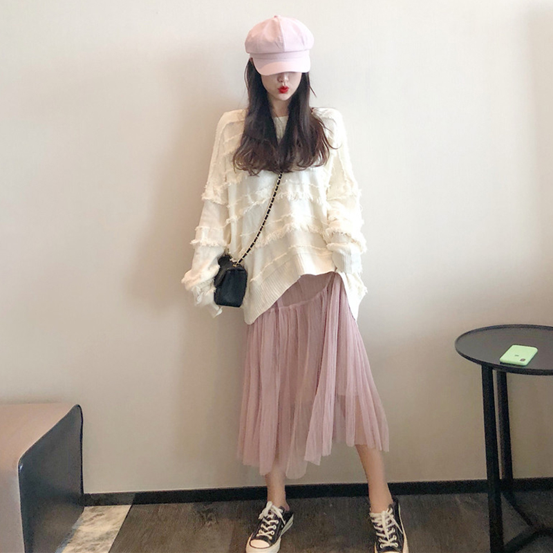 秋裝新款韓版慵懶風流蘇套頭針織毛衣顯瘦高腰網紗半身裙兩件套女