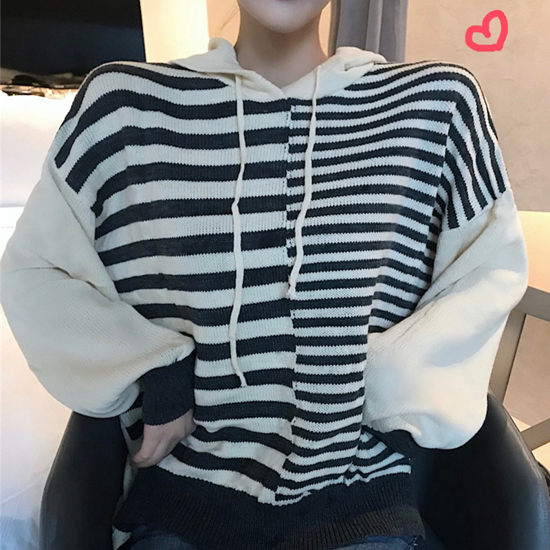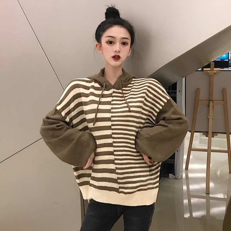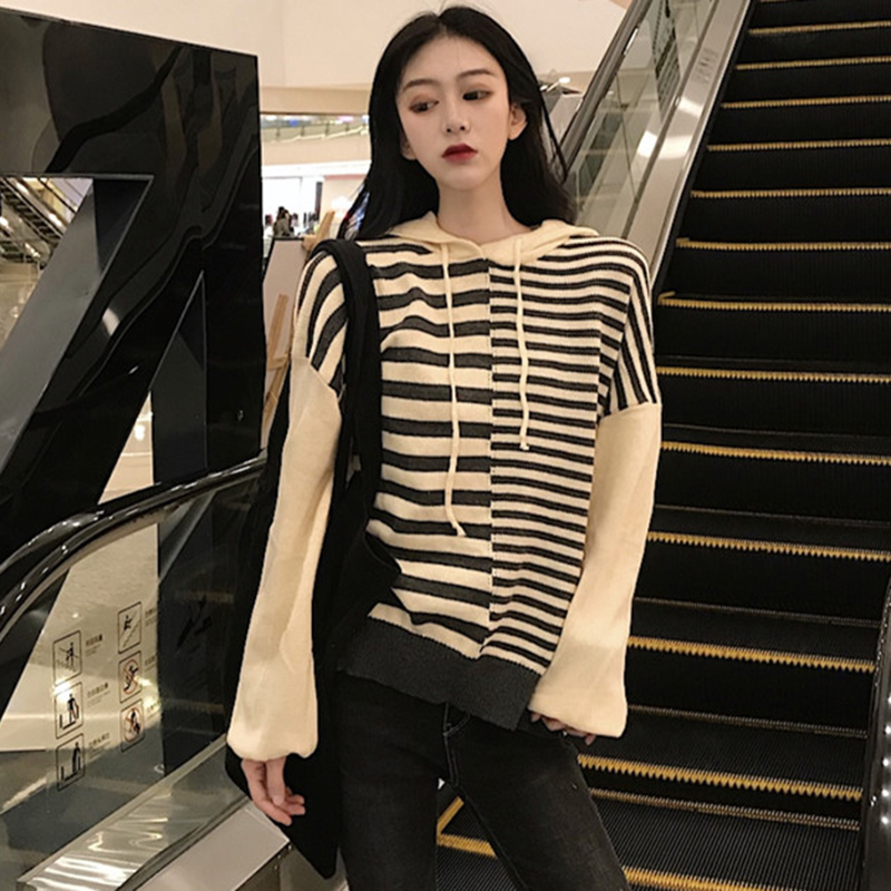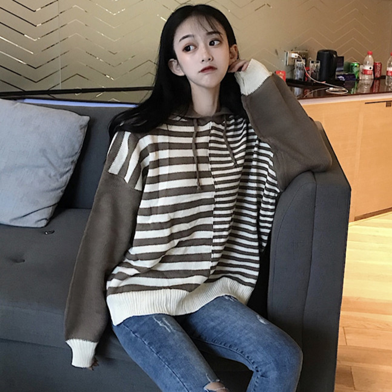 時尚條紋針織衫女秋冬裝2018新款學生連帽外套寬松慵懶風長袖上衣