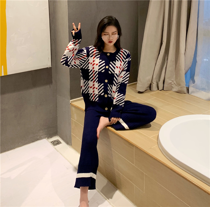 韓版新款時尚套裝chic復古撞色格紋毛衣外套寬松針織闊腿褲兩件套