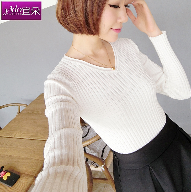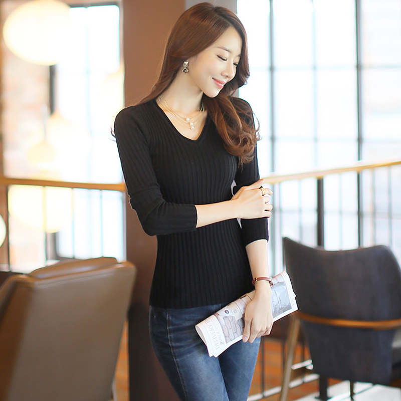 / V領黑色短款秋冬毛衣女長袖針織衫套頭修身打底毛衣針織打底衫女