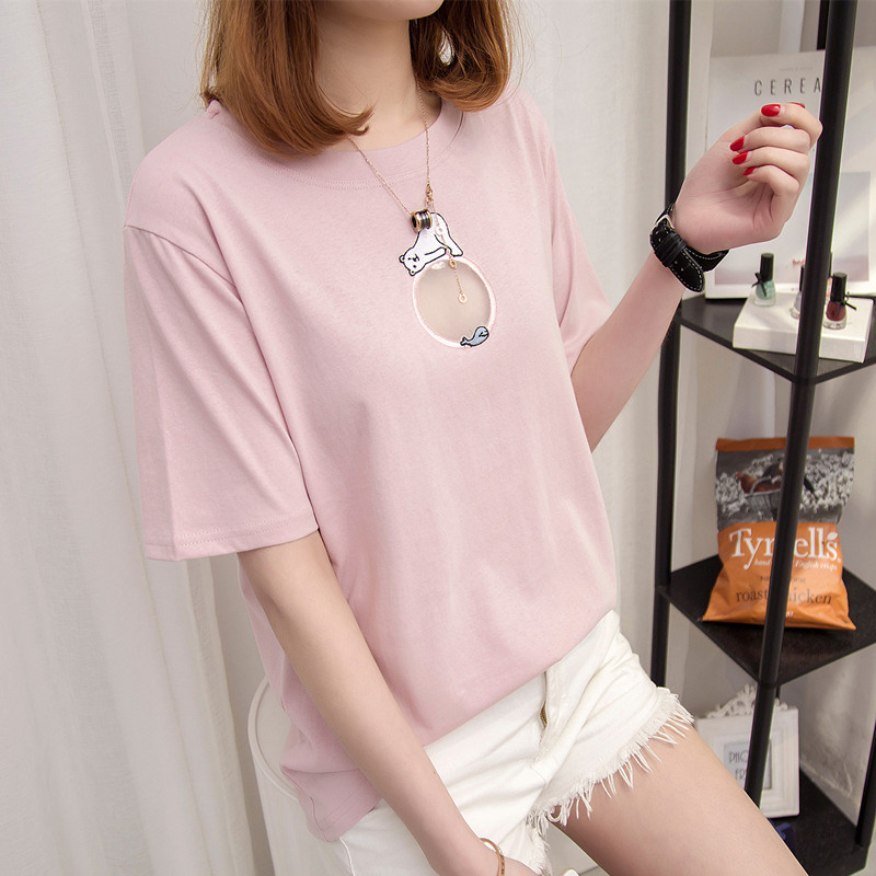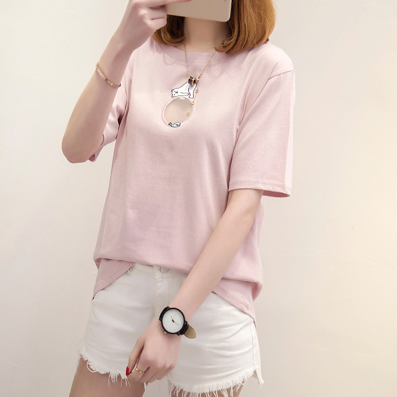 / 女裝夏裝新款潮上衣女夏短袖t恤女鏤空簡約時尚寬松體恤衫
