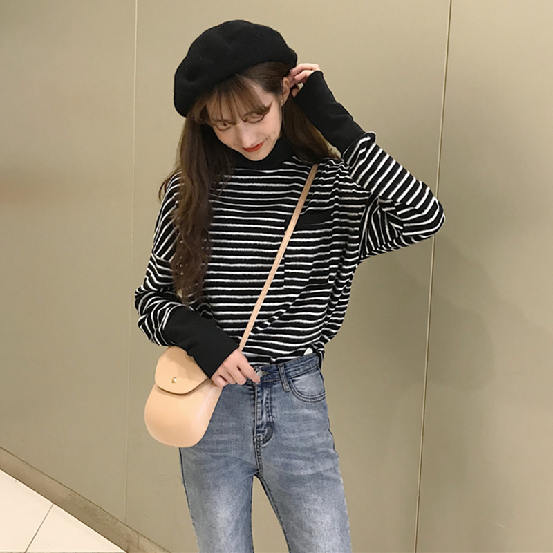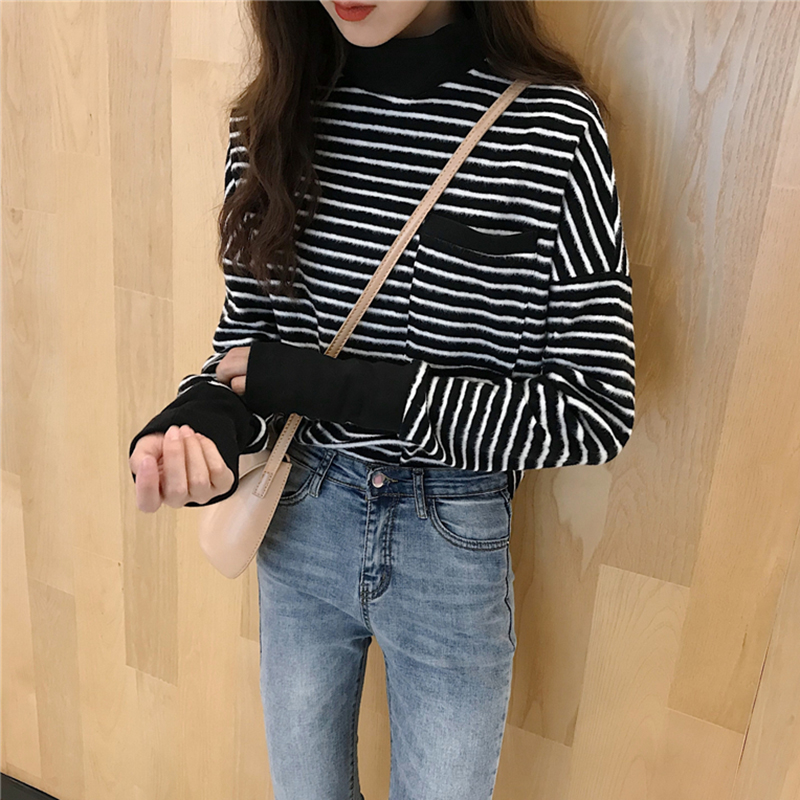 / 時尚條紋拼接螺紋打底衫衛衣秋冬女裝2018新款學生休閑長袖上衣潮