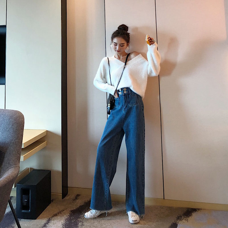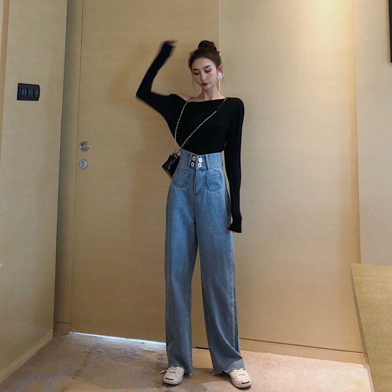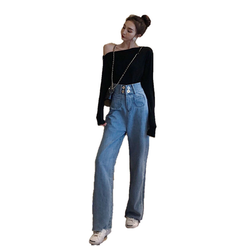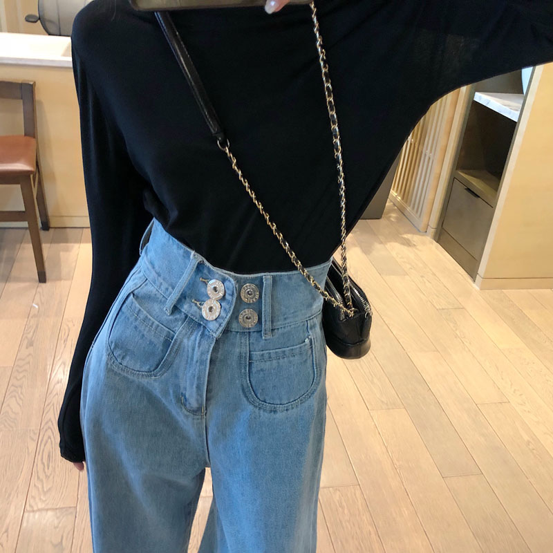 復古港風高腰顯腿直筒四顆紐扣牛仔褲女學生時尚百搭秋季闊腿長褲