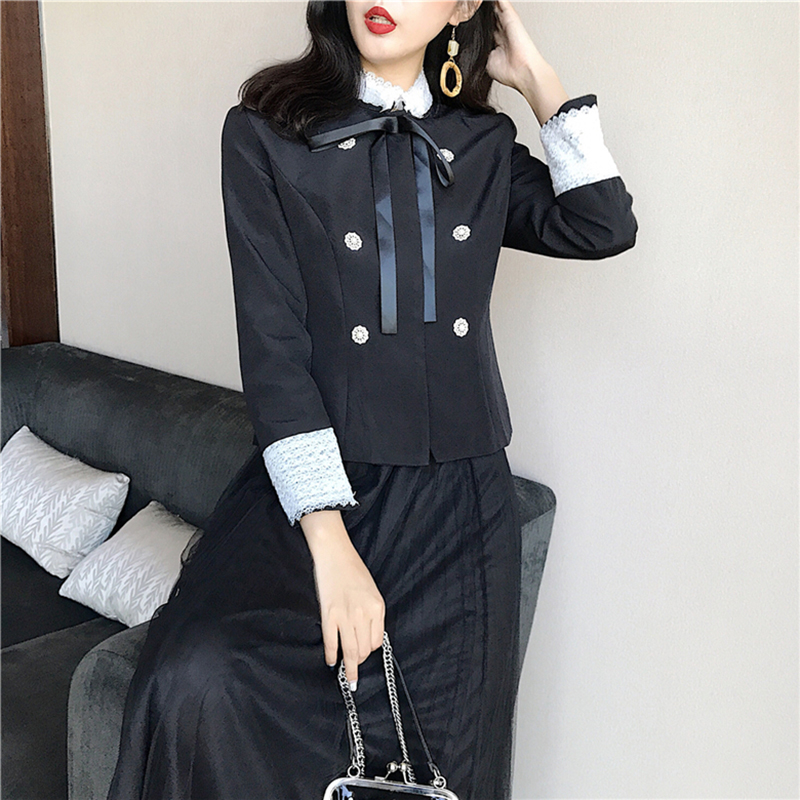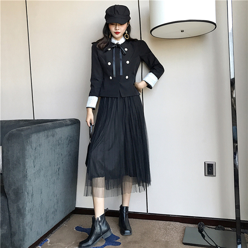 / 氣質女神兩件套冬裝新款蝴蝶結修身短款外套中長款高腰網紗半身裙