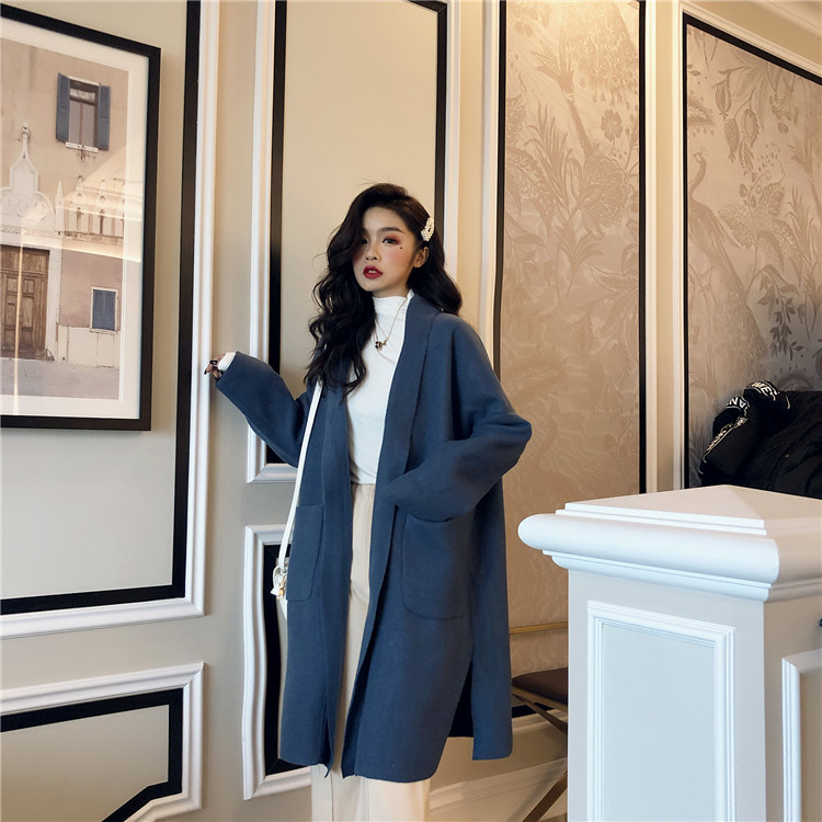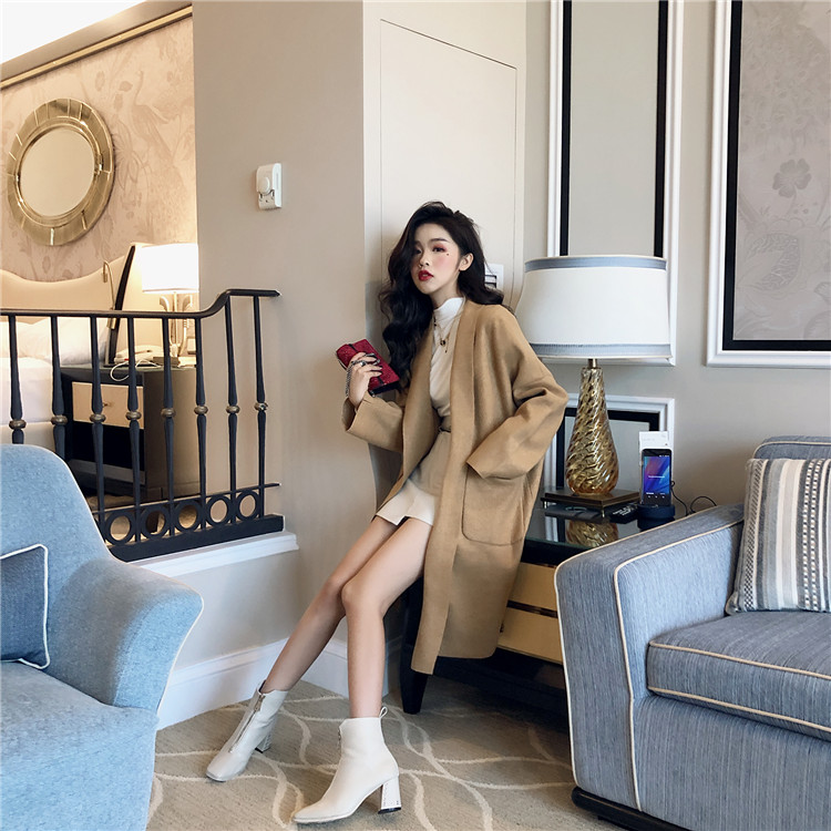 秋冬韓版百搭款氣質長袖毛呢外套女中長款過膝妮子大衣(送腰帶)