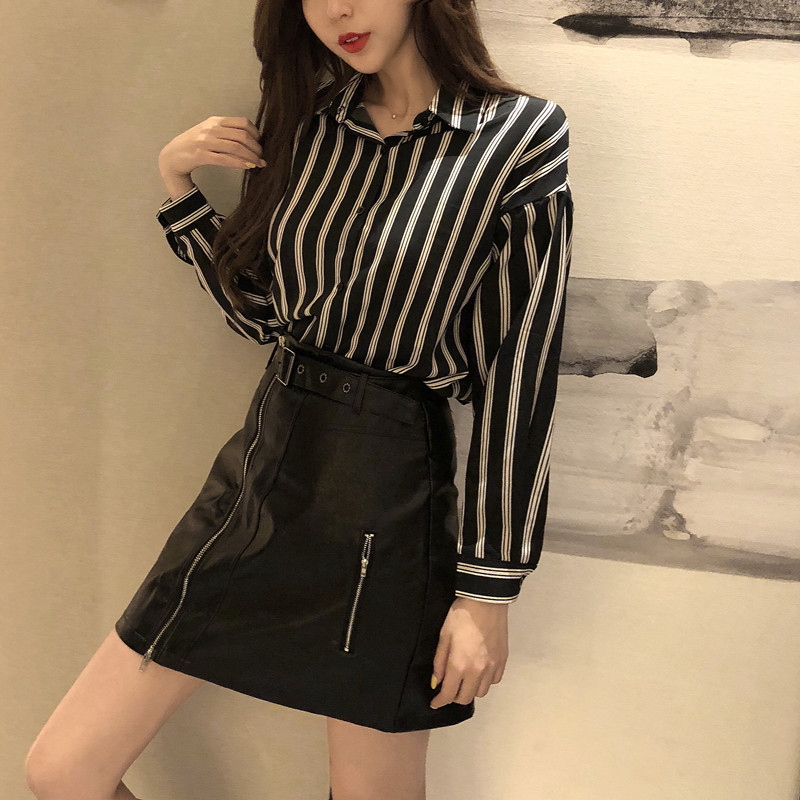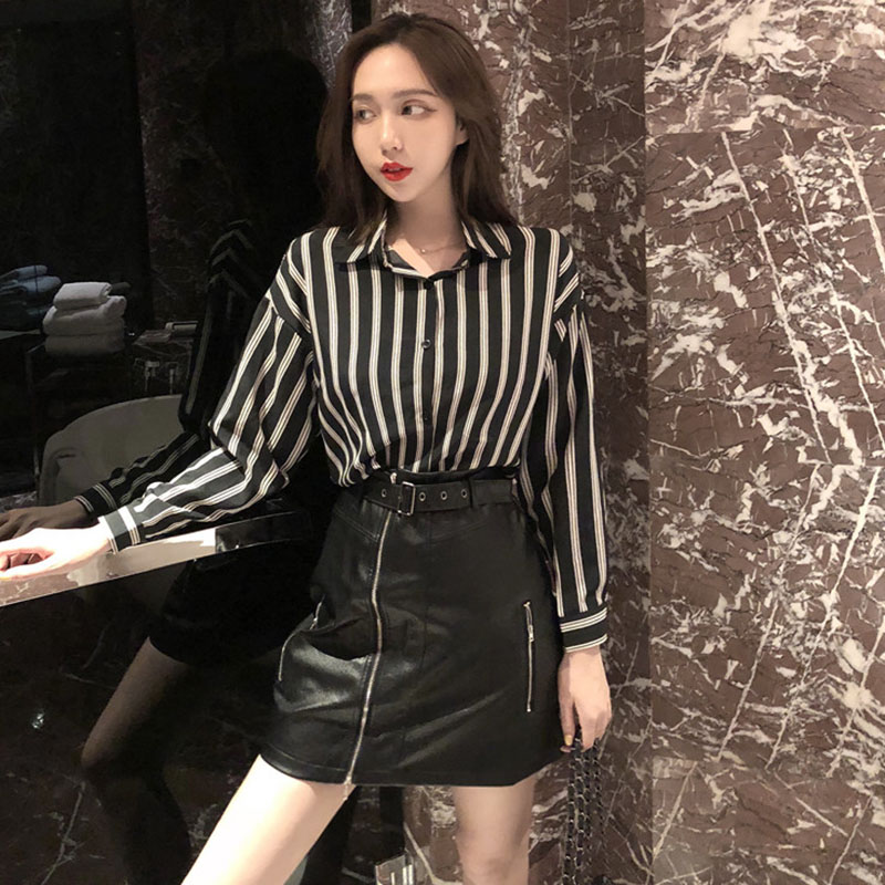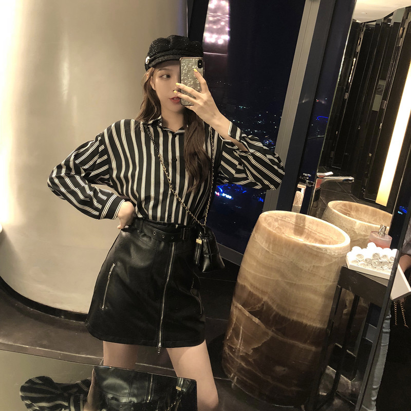 / 港味chic風時尚長袖條紋網紅襯衣+高腰pu包臀拉鏈腰帶短裙兩件套