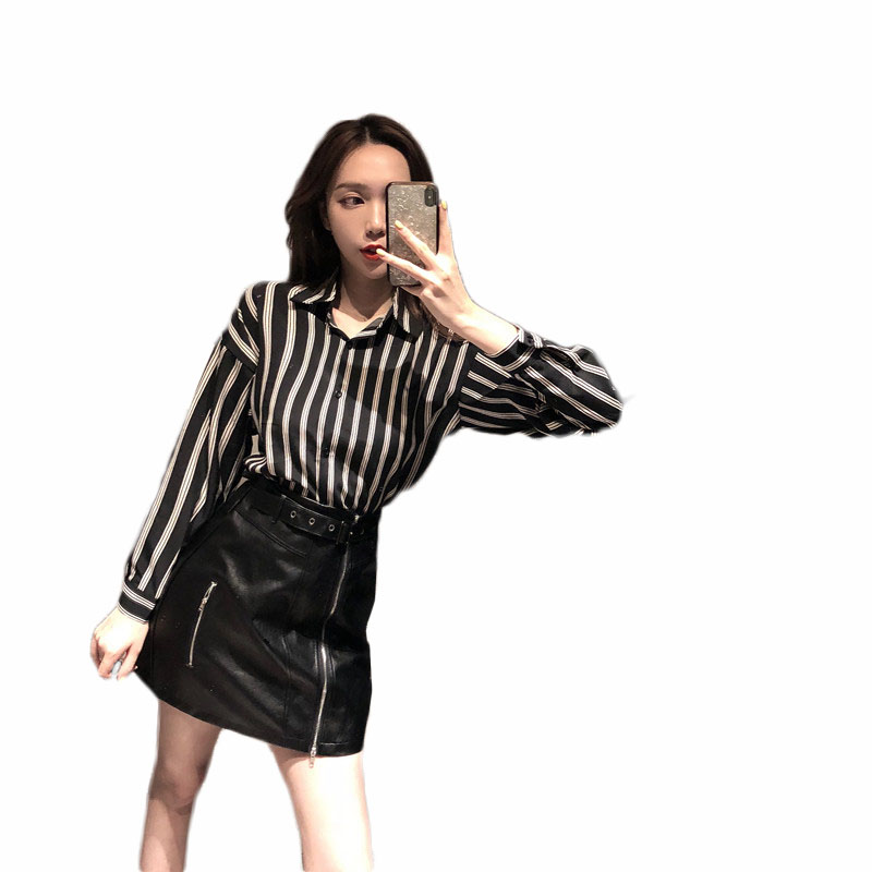 港味chic風時尚長袖條紋網紅襯衣+高腰pu包臀拉鏈腰帶短裙兩件套