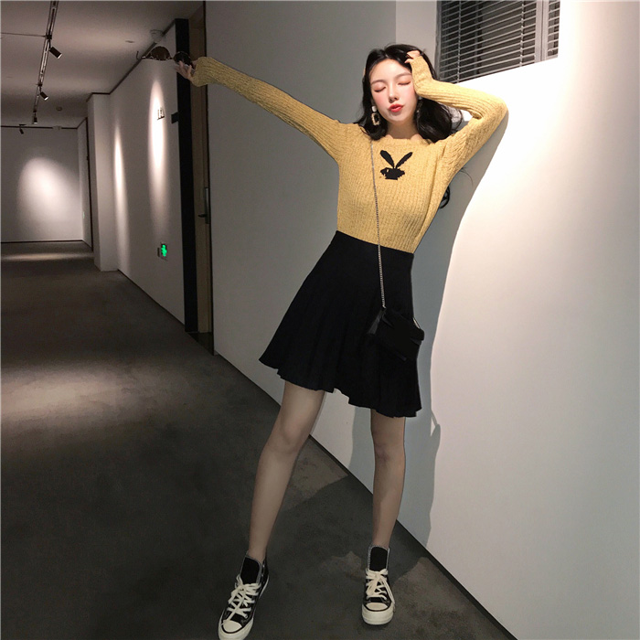 秋冬新款韓版顯瘦修身長袖毛線針織衫壓折高腰針織半身裙時尚套裝