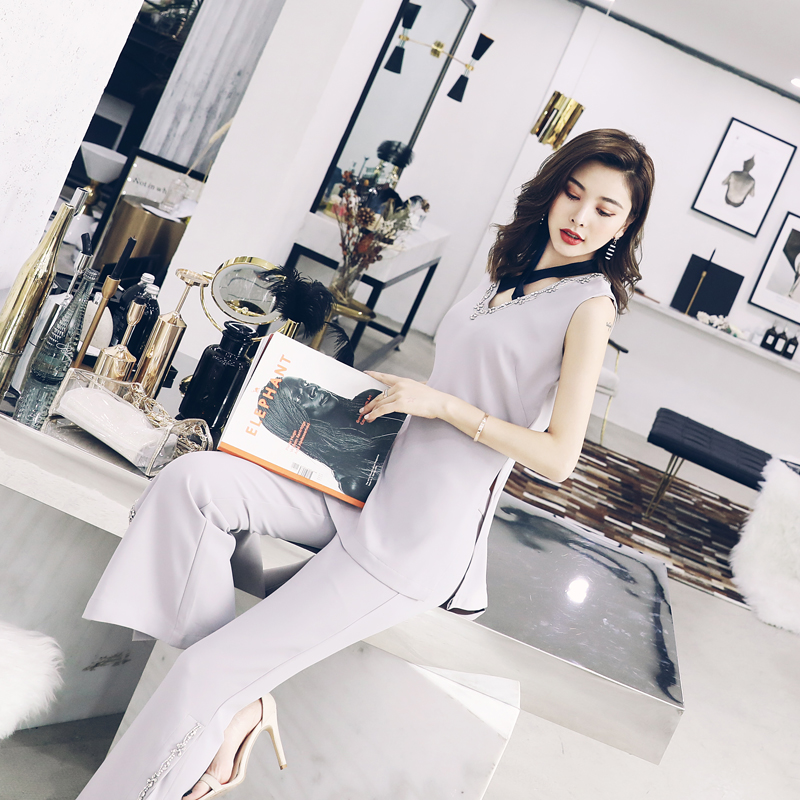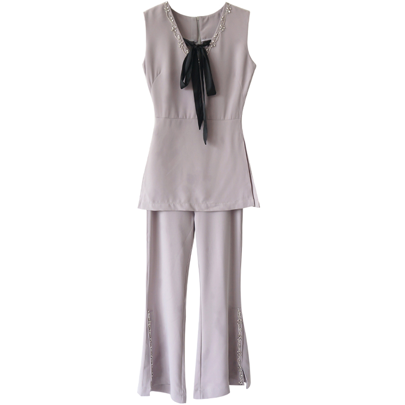 2018夏季新款時髦洋氣名媛氣質職業釘珠上衣開叉闊腿褲套裝兩件套
