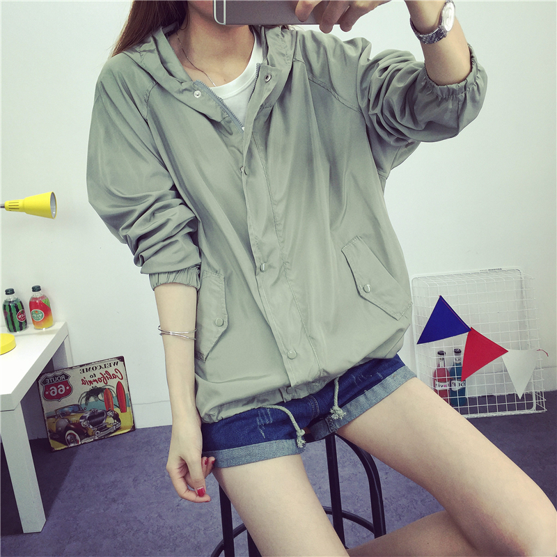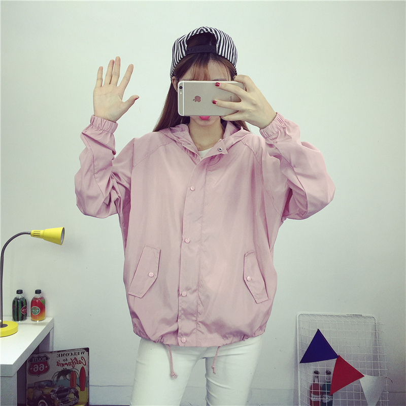 夏季原宿學院風寬松學生長袖大碼薄款防曬衣女純色連帽開衫外套潮