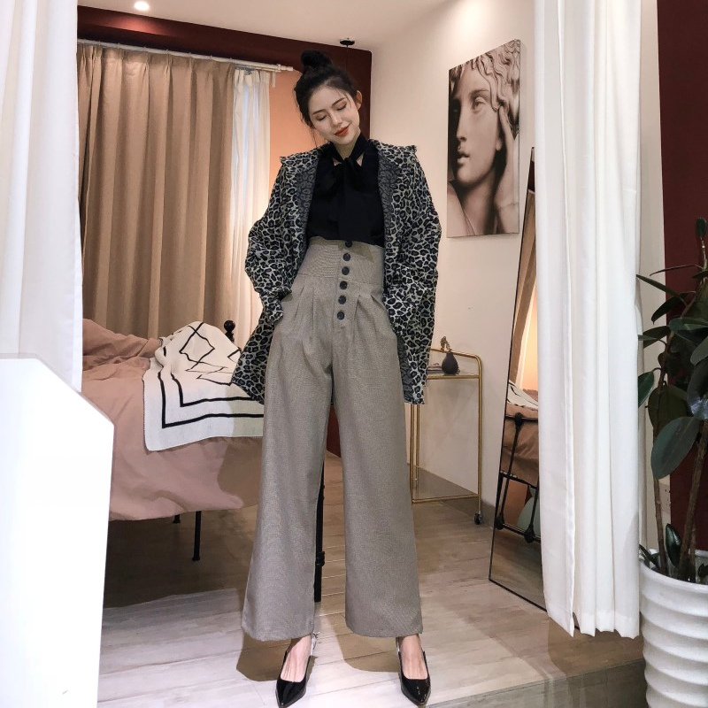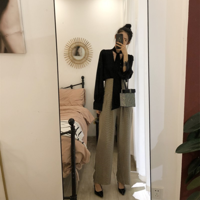 2018秋裝新款韓版套裝百搭氣質雪紡長袖上衣高腰排扣闊腿褲兩件套