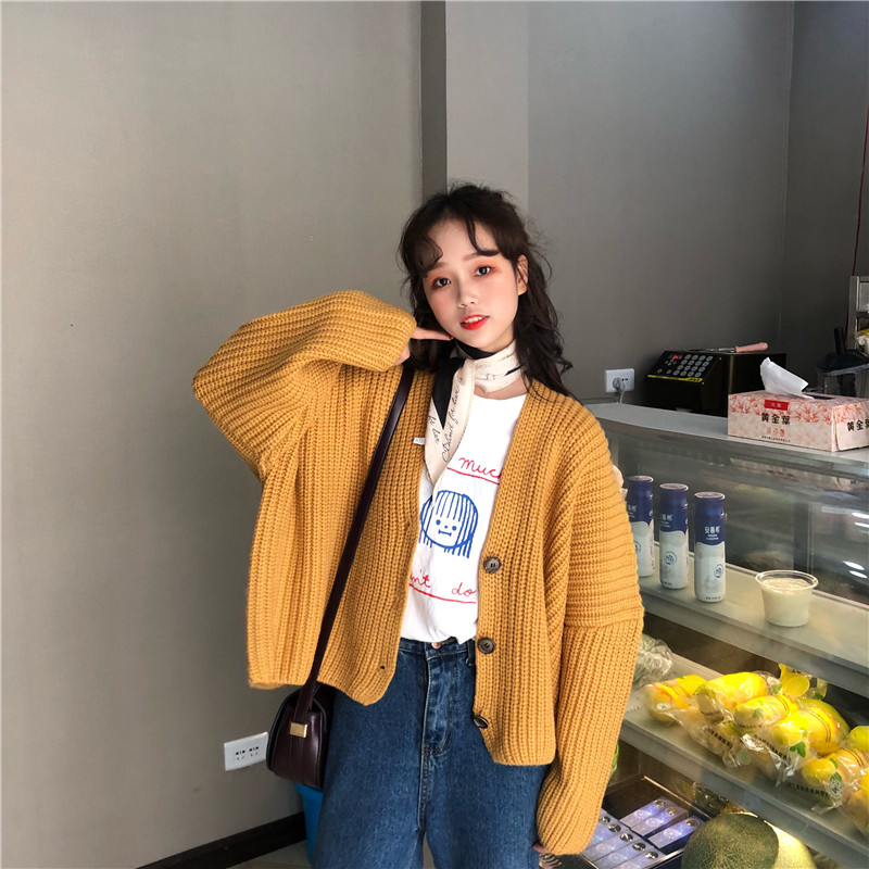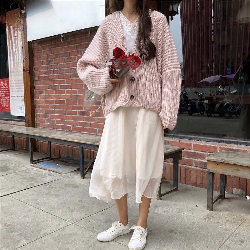 / 秋冬女裝韓版chic慵懶風寬松網紅毛衣針織衫開衫外套+打底連衣裙