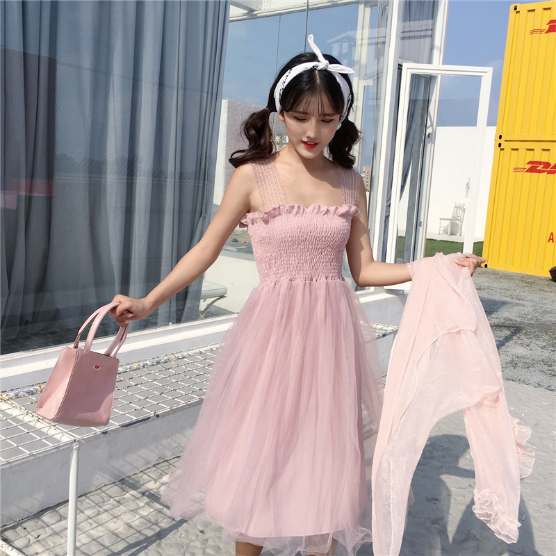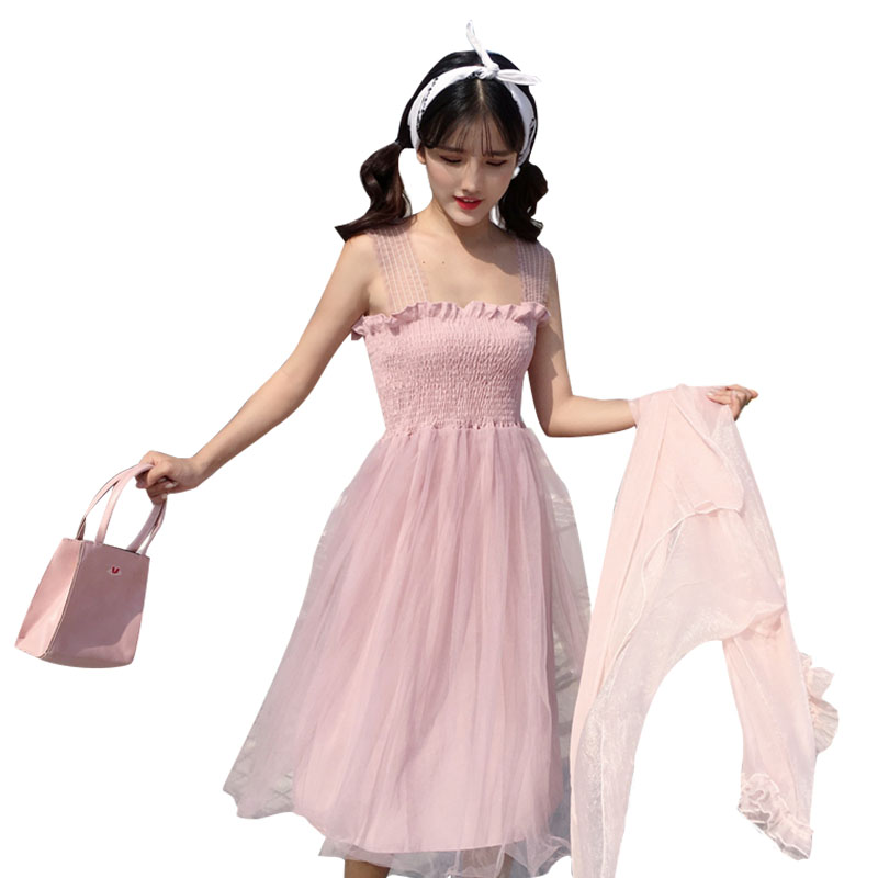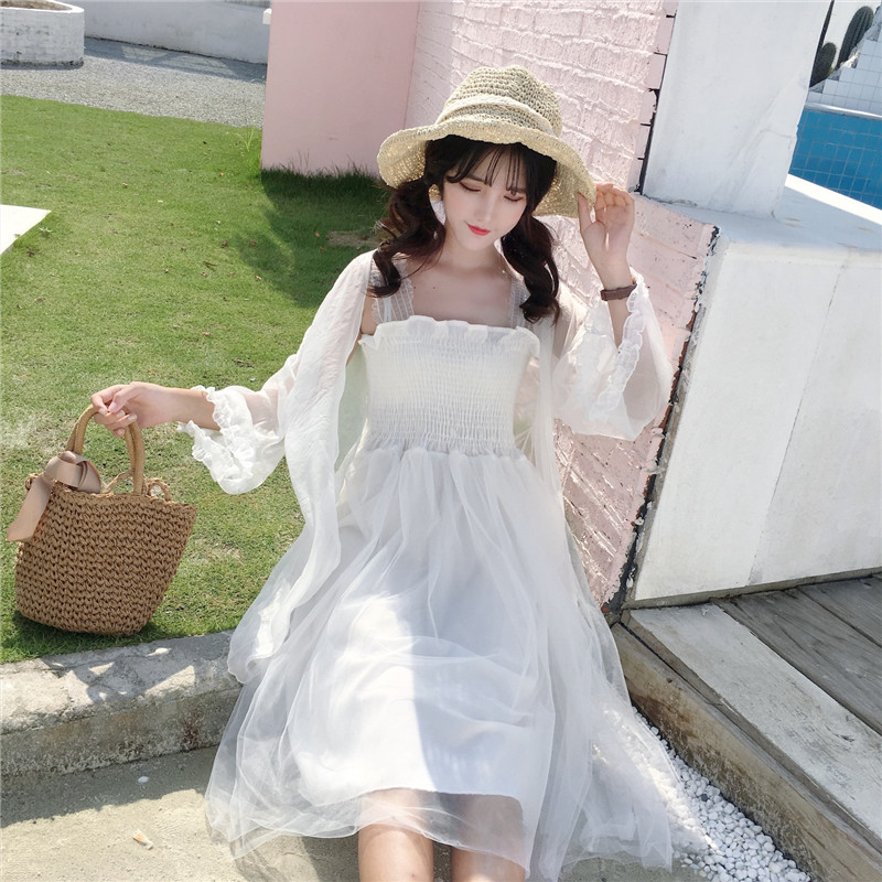 / 夏裝韓版中長款抹胸吊帶連衣裙2018新款紗裙仙女裙長裙女+防曬衣