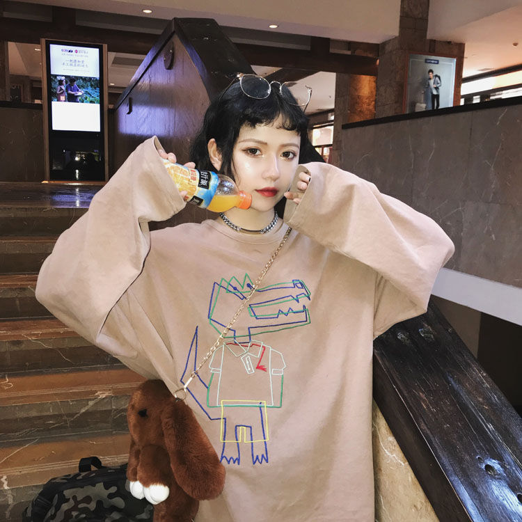 / 秋季韓版中長款原宿BF風寬松搞怪鱷魚刺繡薄款長袖T恤顯瘦上衣女