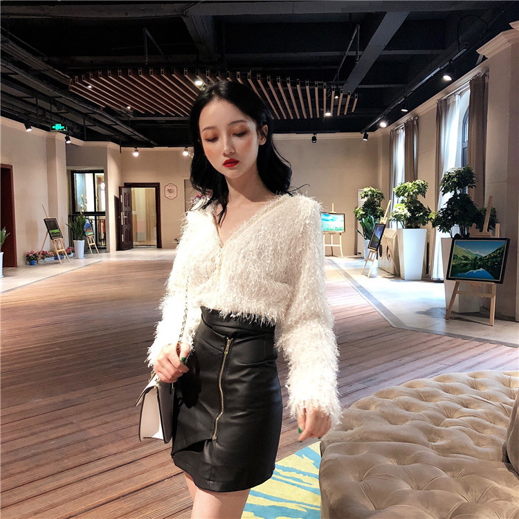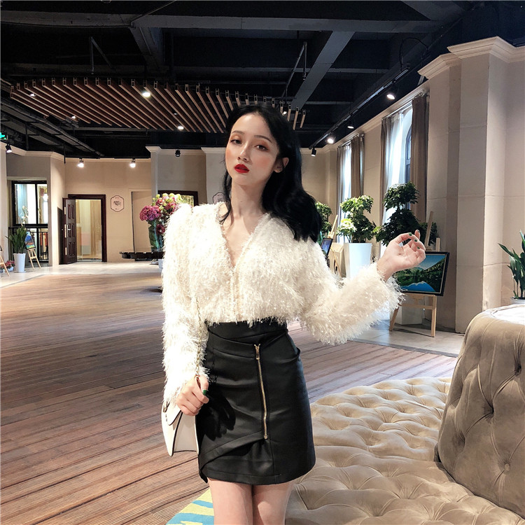 / 女神套裝秋流蘇毛毛開衫小外套上衣+不規則設計感高腰皮裙兩件套