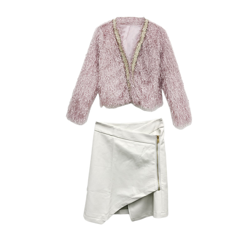 女神套裝秋流蘇毛毛開衫小外套上衣+不規則設計感高腰皮裙兩件套