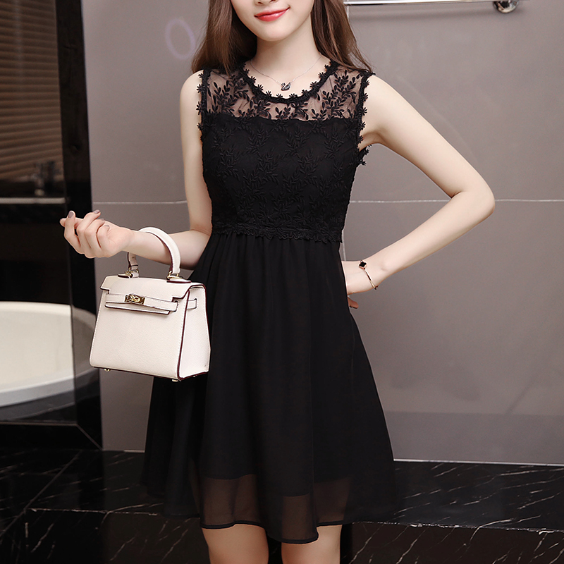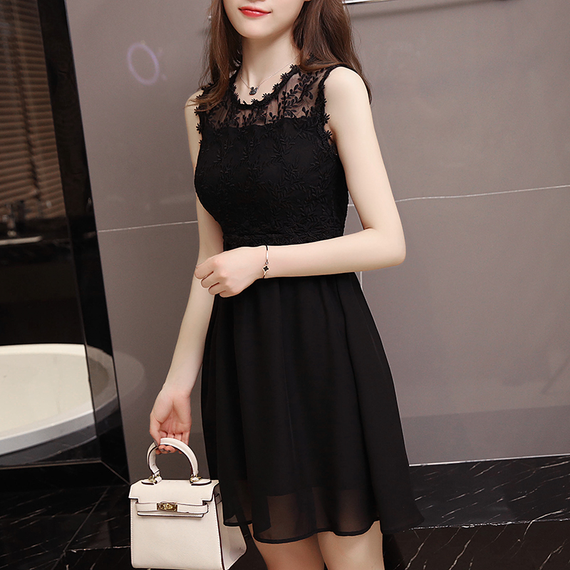 / 夏季鏤空蕾絲拼接無袖小黑裙修身顯瘦小清新甜美雪紡連衣裙子