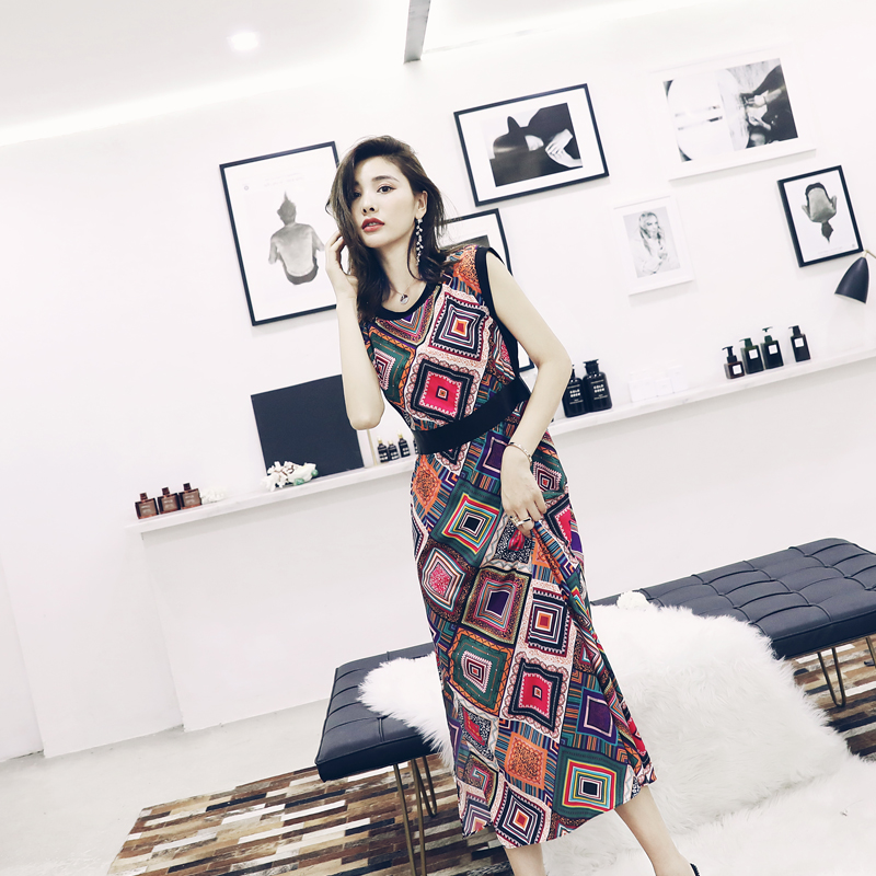 / 氣質名媛女神范女裝夏2018新款高腰無袖拼接印花開叉連衣裙中長款