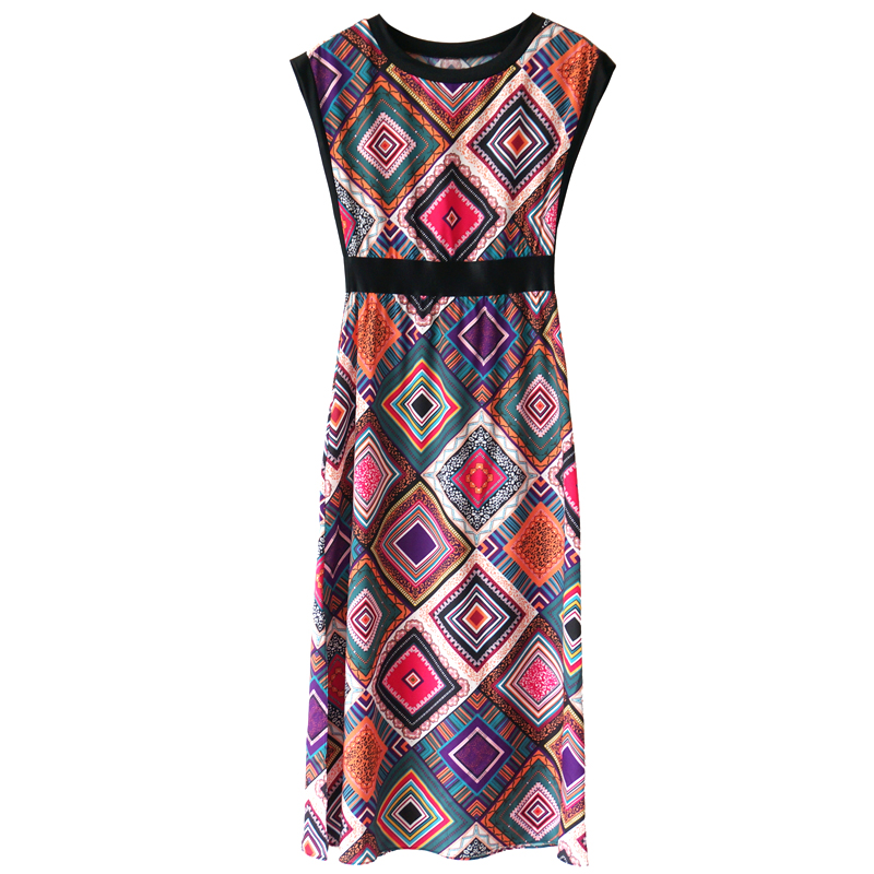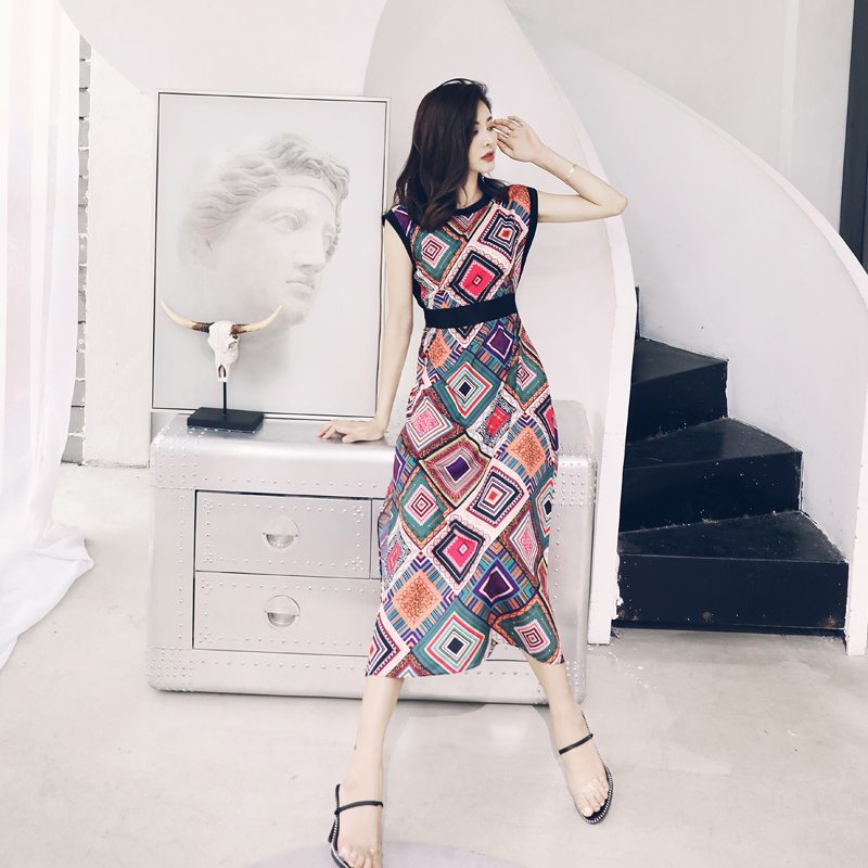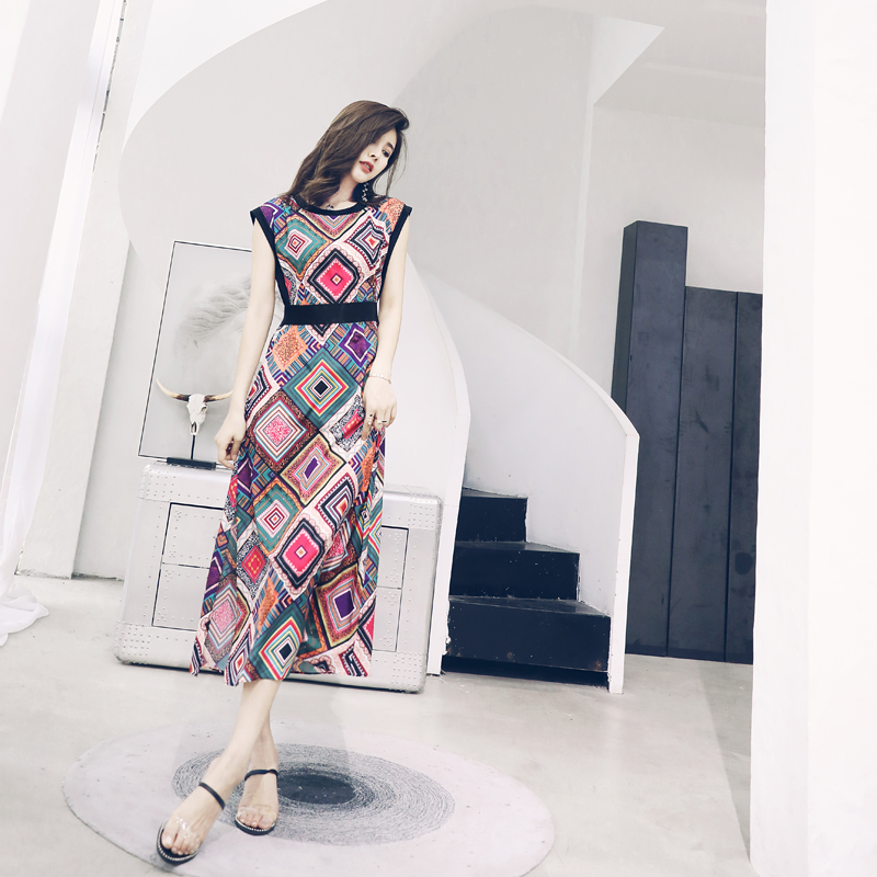 氣質名媛女神范女裝夏2018新款高腰無袖拼接印花開叉連衣裙中長款