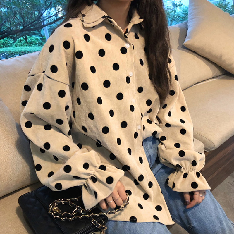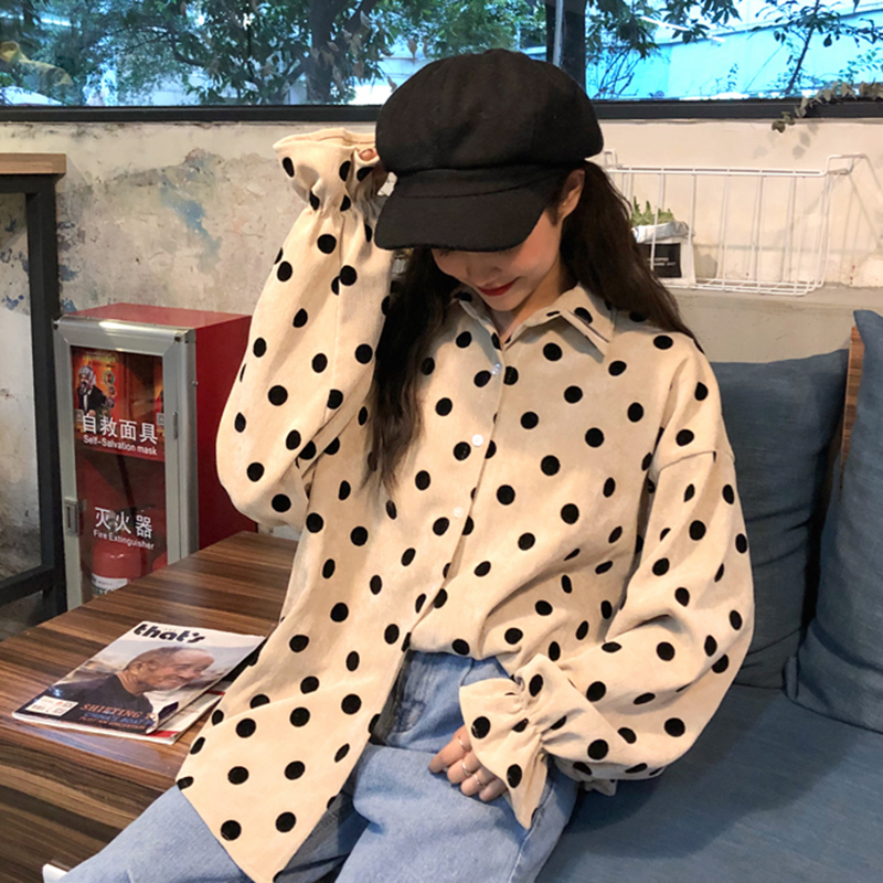 秋冬女裝2018新款燈芯絨寬松氣質波點襯衫時尚雙層領長袖外套上衣