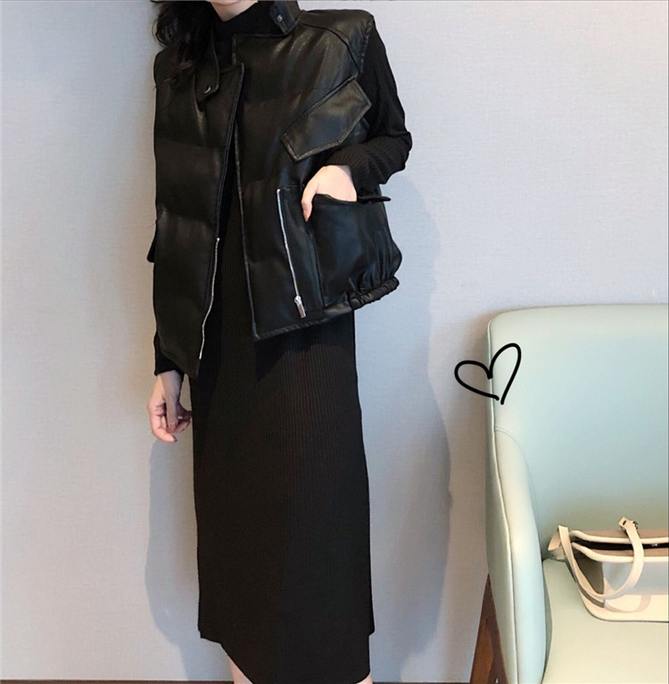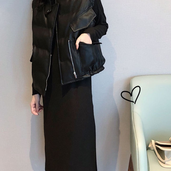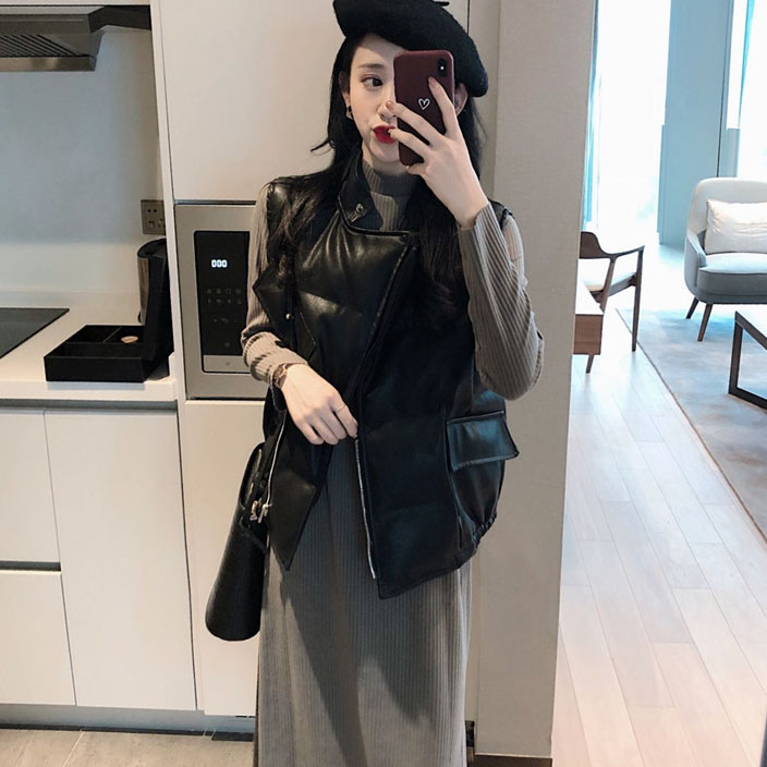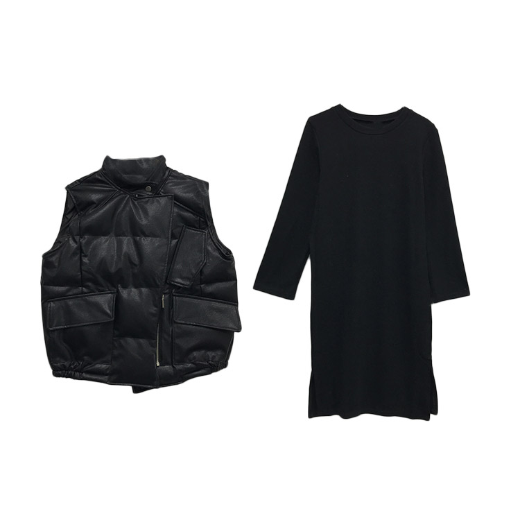 洋氣女神套裝秋冬新款pu皮加厚棉馬甲+百搭中長款連衣裙女分開拍