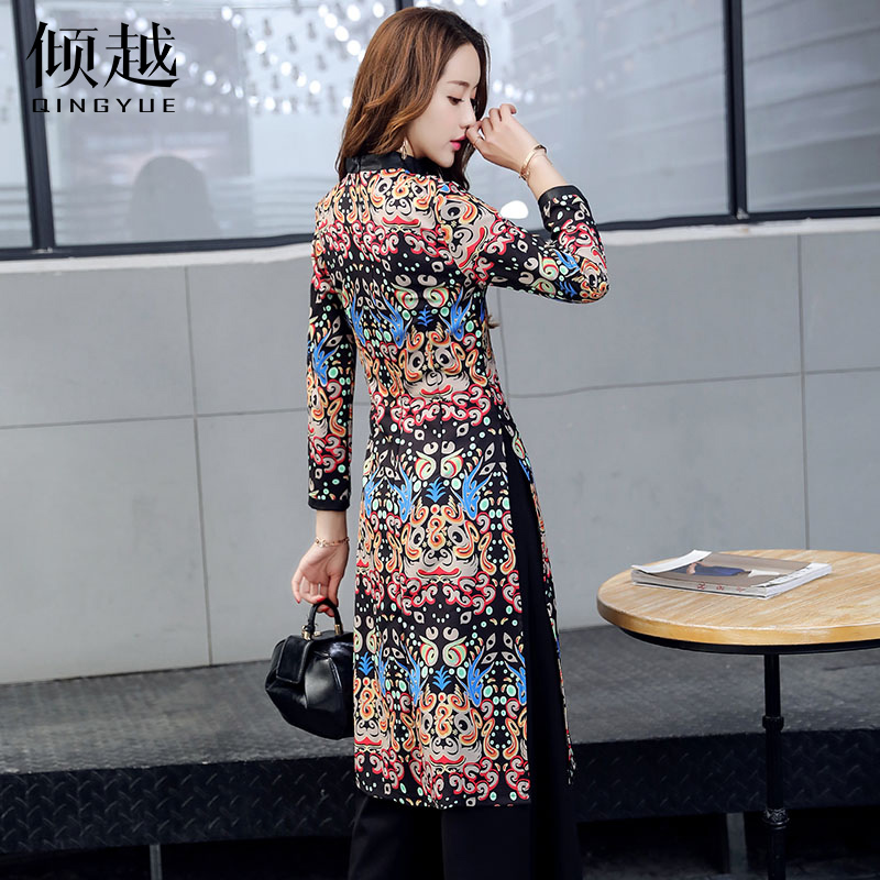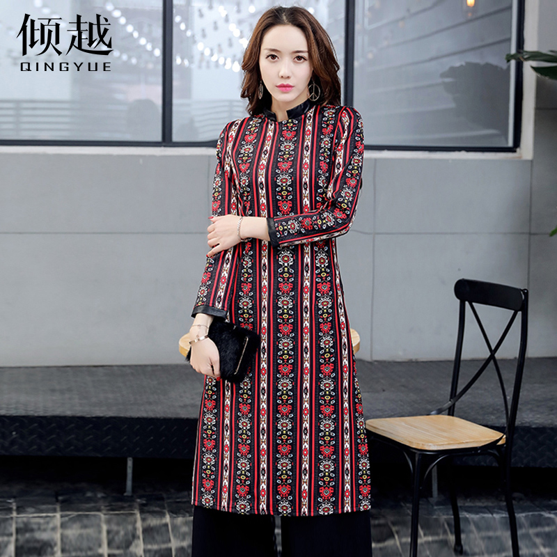 傾越2017春裝新款民族風女裝連衣裙中長裙套裝闊腿褲春秋長袖修身