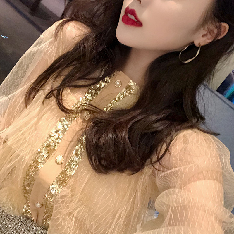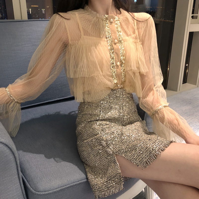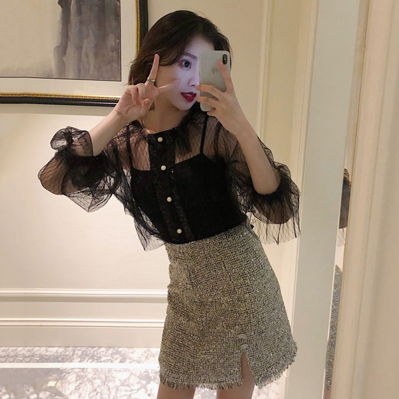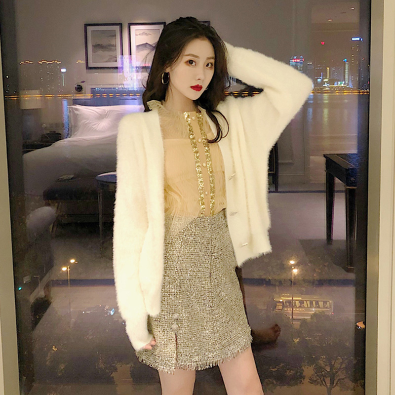 套裝女秋冬新款毛衣外套洋氣長袖網紗衫亮絲流蘇高腰包臀半身裙子