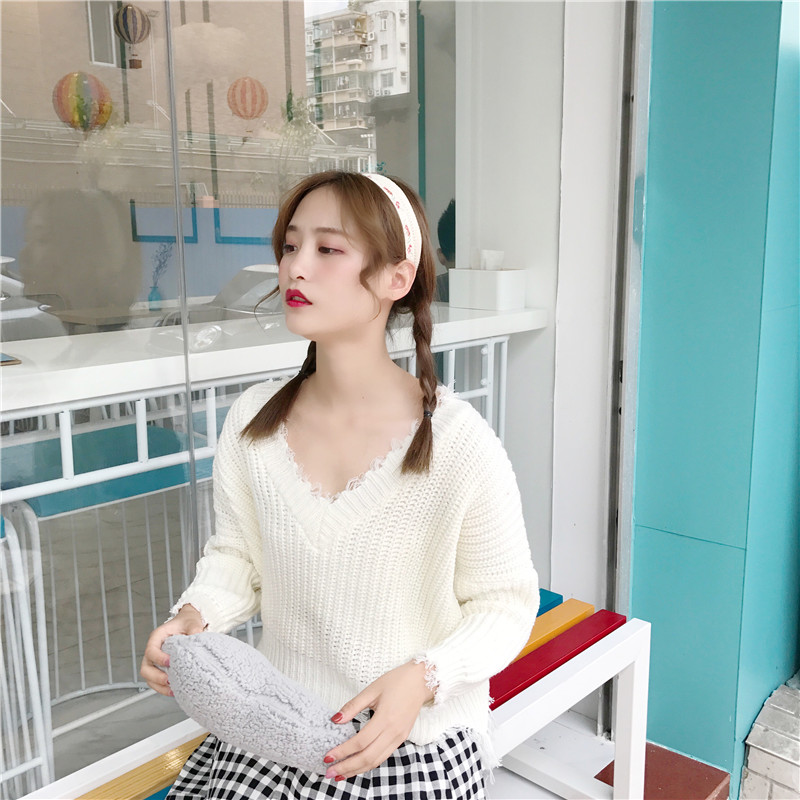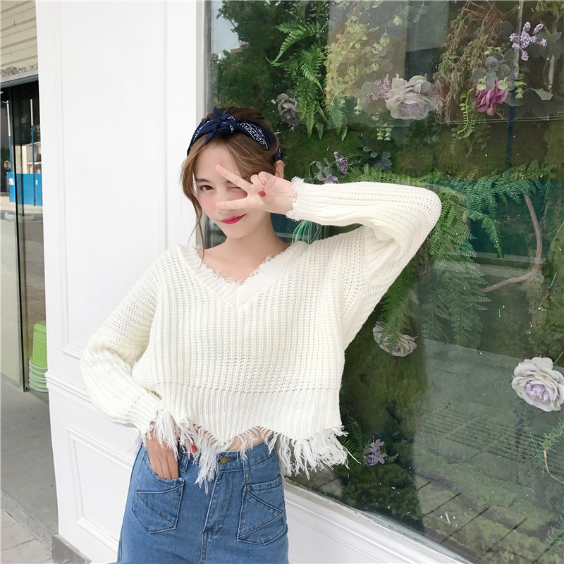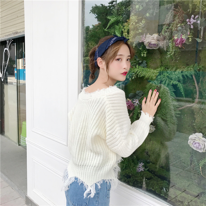 / 秋季女裝韓版寬松套頭V領純色不規則破邊針織衫長袖休閑毛衣上衣