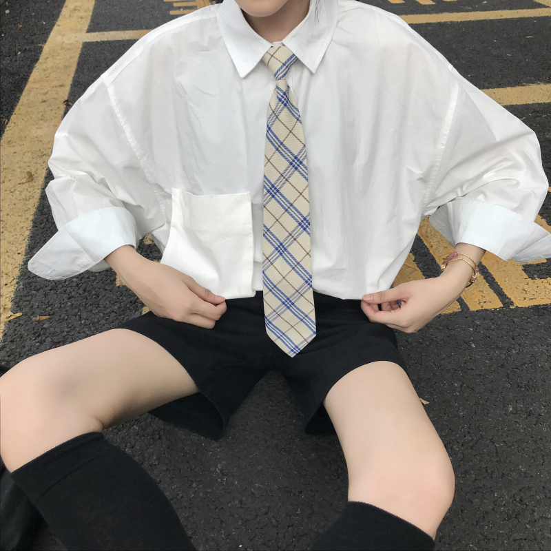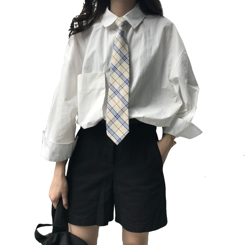 / 襯衫女裝秋季2018新款韓版寬松百搭口袋純色學生長袖襯衣潮送領帶
