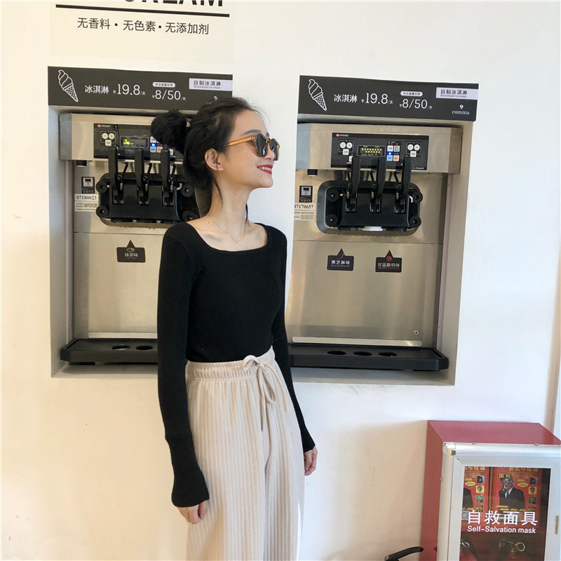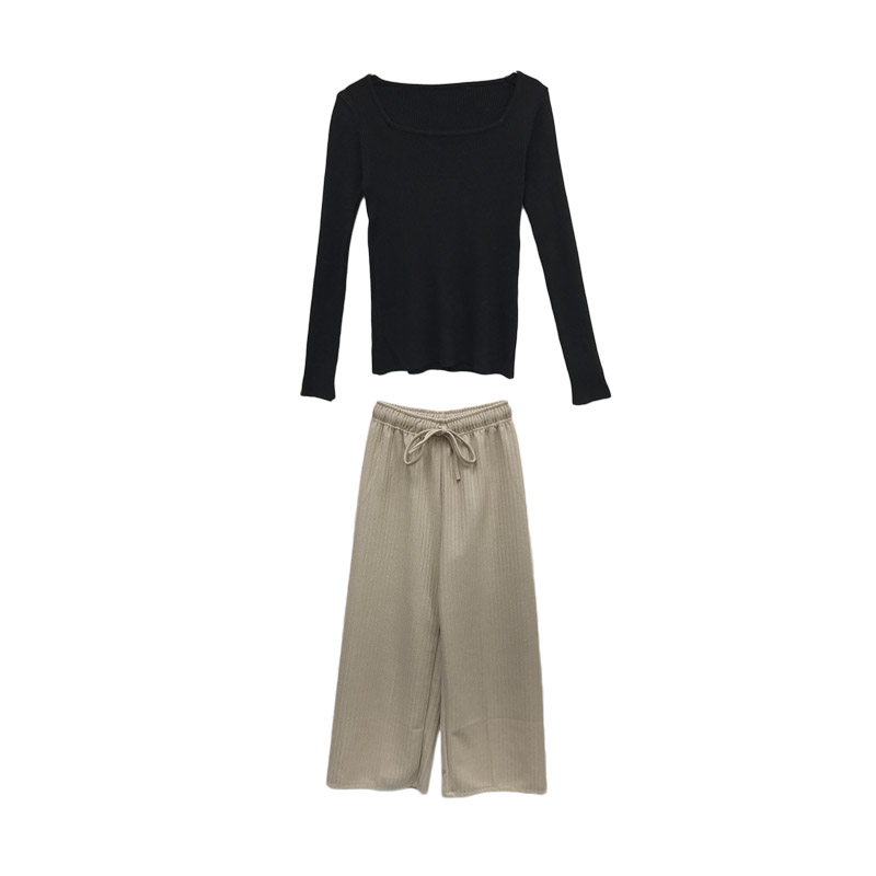 秋冬亮色顯白加厚方領打底衫內搭毛衣+百搭松緊腰闊腿針織褲套裝